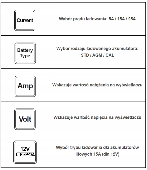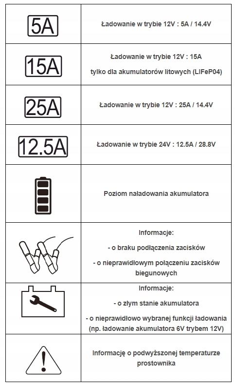 - Струм заряджання: 5/25 A (12 В) / 15 A (12 В LiFePO4) / 12,5 А (24 В)