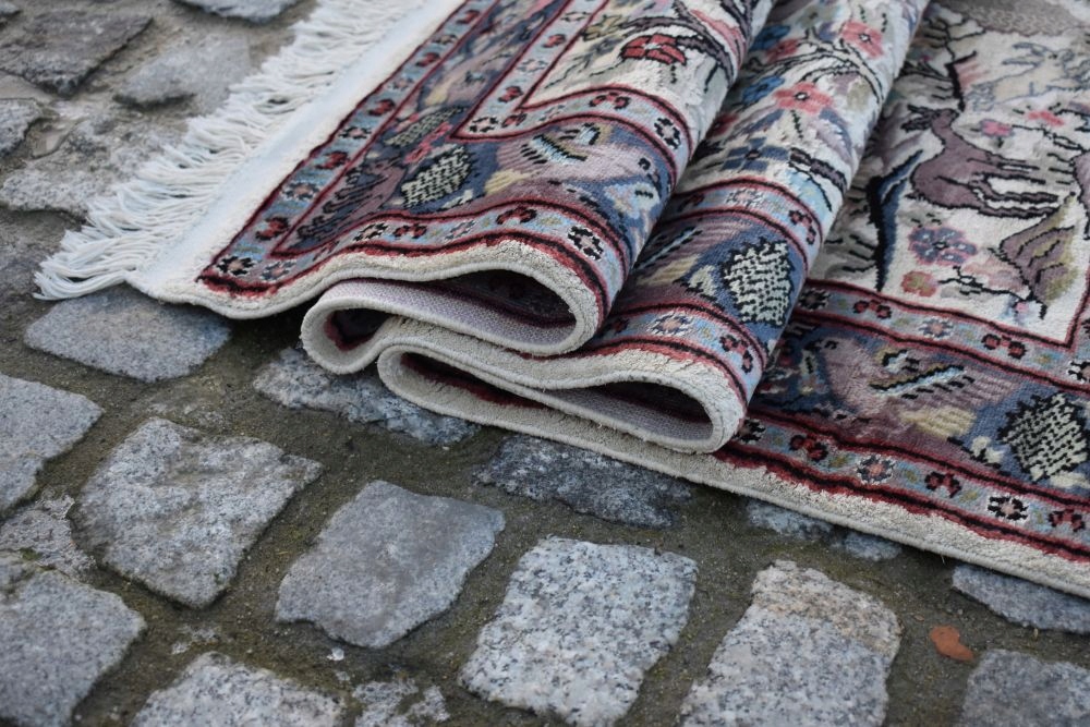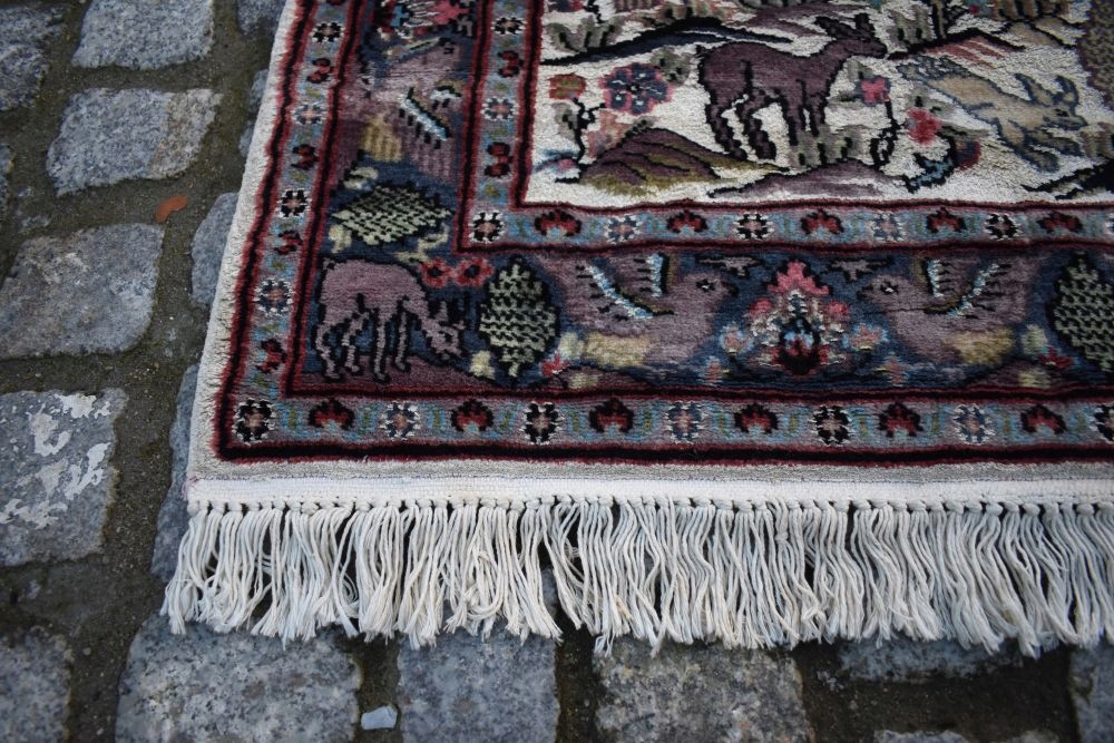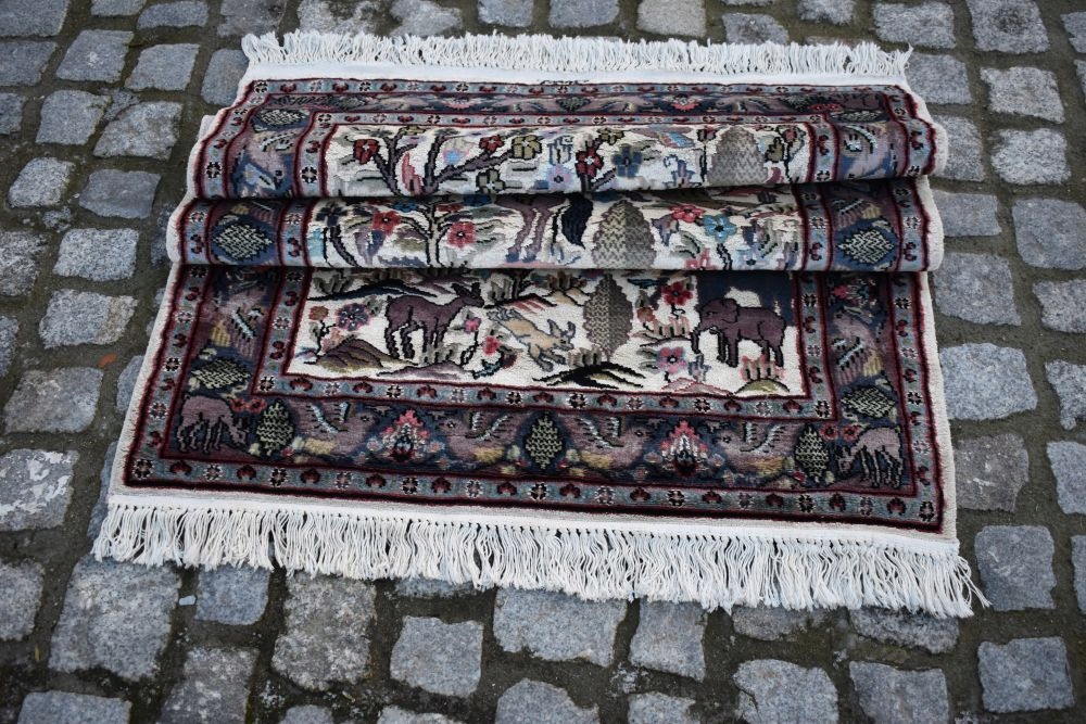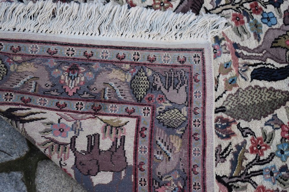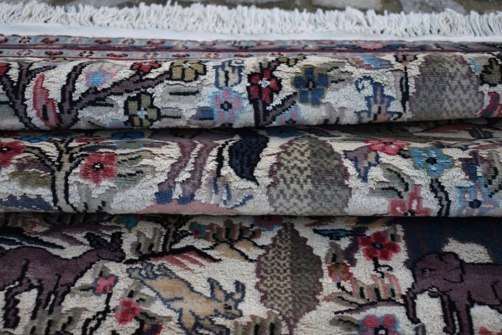 На наступному аукціоні пропоную вамз натурального шовку та кашемірової вовни (вишиті вовняні орнаменти на екрю тло), хитромудро витканий – блискучий східний килим / килим – GHOM із зображенням мотиву «полювання». Килим додатково підписаний у ворсі підписом ткача.