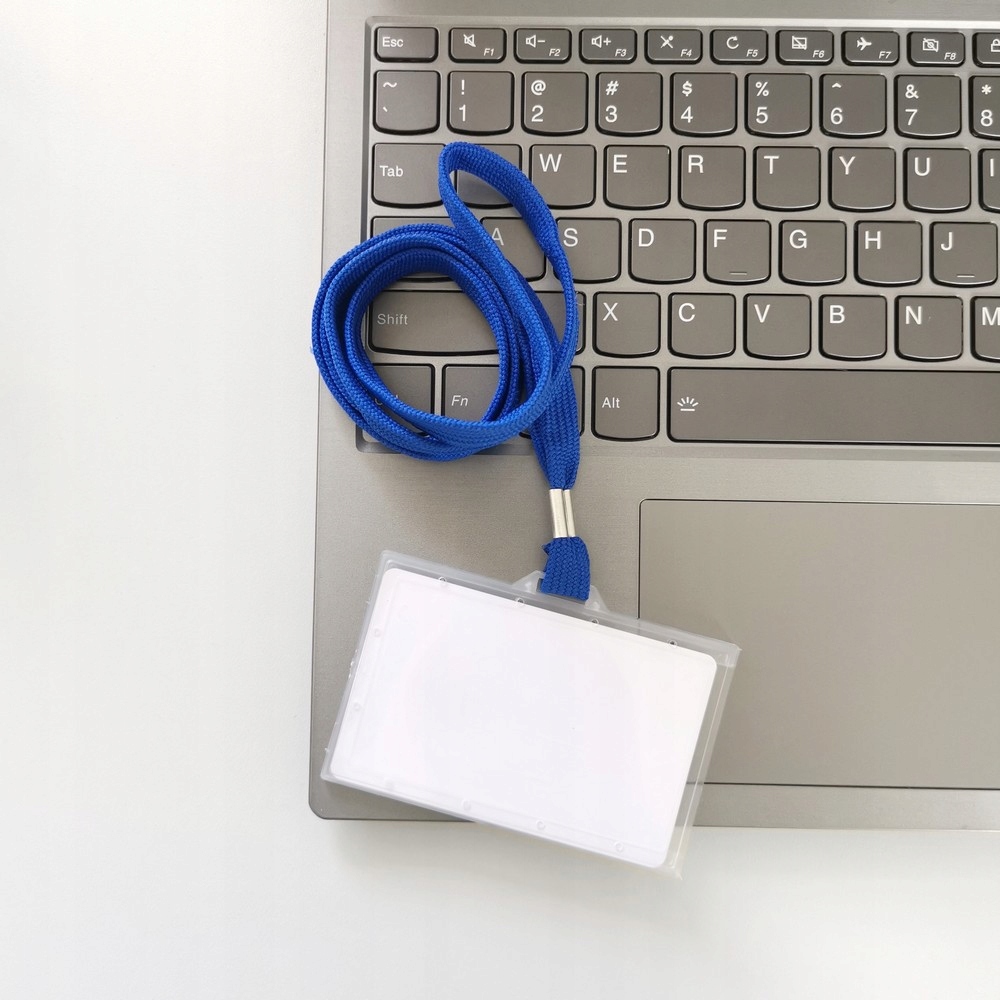 Ідентифікатор для магнітних карт, виготовлений з жорсткого прозорого матеріалу, розмір 92 x 59 мм. Оснащений синім шнурком. Виріз для пальця полегшує вставлення та виймання картки зсередини. Призначений для використання під час ярмарків, конференцій, тренінгів тощо.
