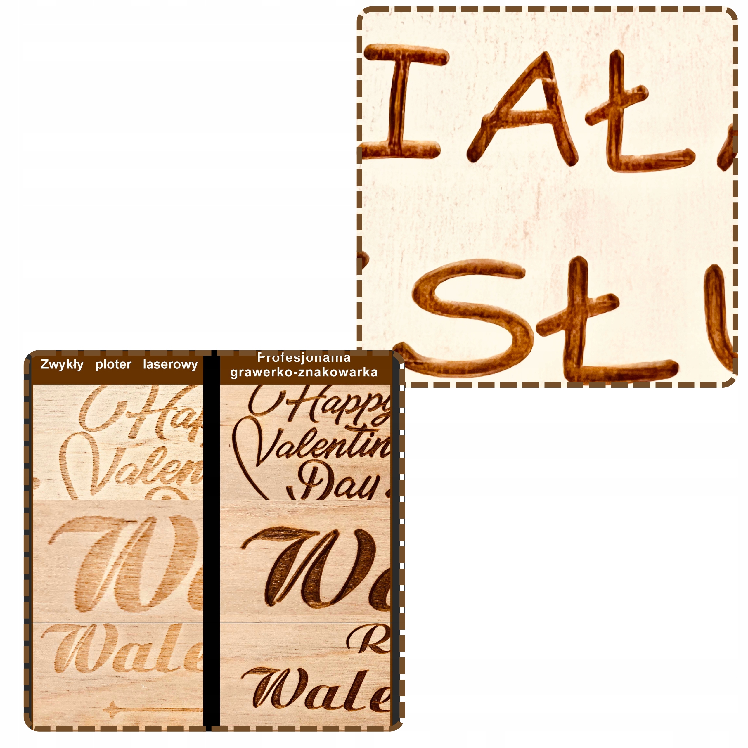➡️ Різницю між нашим продуктом і продукцією конкурентів можна побачити на фото нижче, де видно досить чітку різницю в якості гравірування, яке відбувається під час гравірування лазерним плоттером і спеціалізованим маркувальним верстатом, у якому крок лазерного променя у випадку гравірування фанери встановлено на 0,01 мм, і лазерним плоттером CO2, у якому стандартний крок становить 0,2 мм, що дає у 20 разів більшу точність і яскраві кольори.