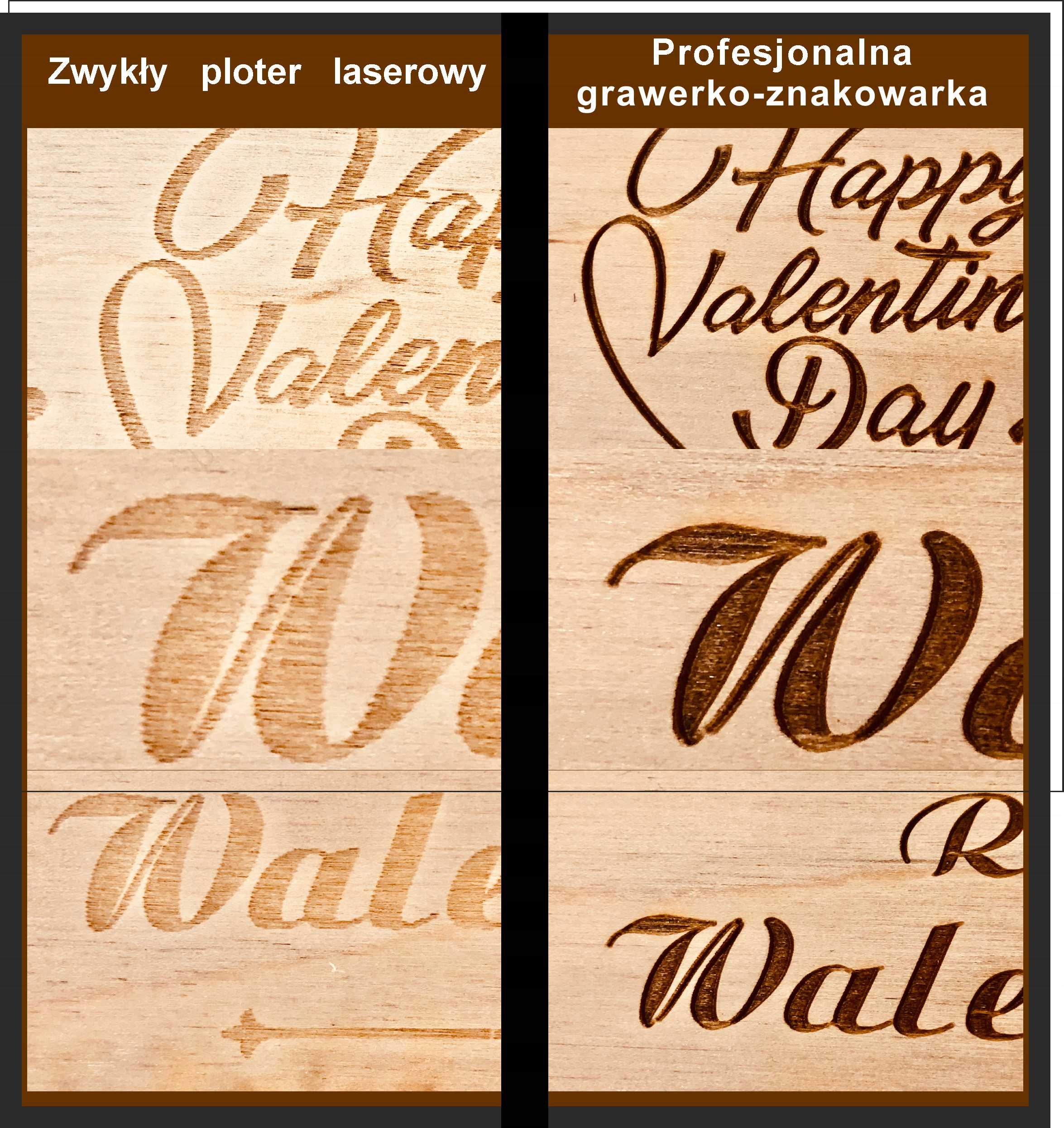 Відмінність нашого продукту від продукції конкурентів представлена на фото нижче, де видно досить чітку різницю в якості гравірування, що виникає при гравіруванні лазерним плоттером і спеціалізованим маркувальним верстатом, в якому крок шляху лазерного променя встановлюється на 0 під час гравірування фанери, 01 мм і CO2-лазерного плоттера зі стандартним кроком 0,2 мм, що забезпечує у 20 разів більшу точність і яскраві кольори.
