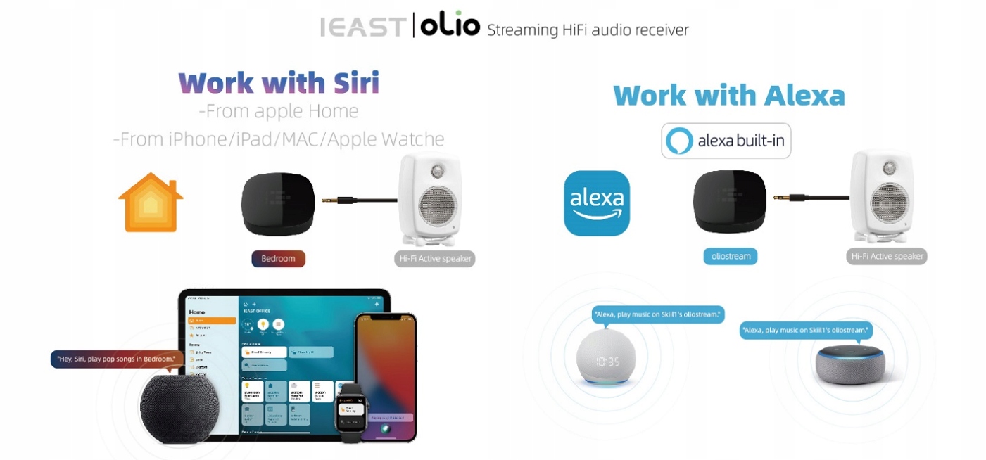 iEAST OlioStream працює з пристроями AMZ Alexa та Siri. Ви можете легко керувати своїм пристроєм, просто розмовляючи з ним.