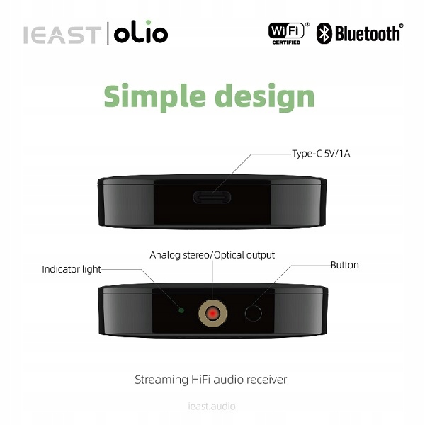 iEAST olio — це інноваційний приймач потокового аудіо Hi-Fi, оснащений бездротовим підключенням Wi-Fi і Bluetooth, який може перетворити наявні динаміки, звукові панелі або комплекти домашнього кінотеатру на бездротову мультикімнатну звукову систему шляхом підключення до домашньої мережі. Wi-Fi.