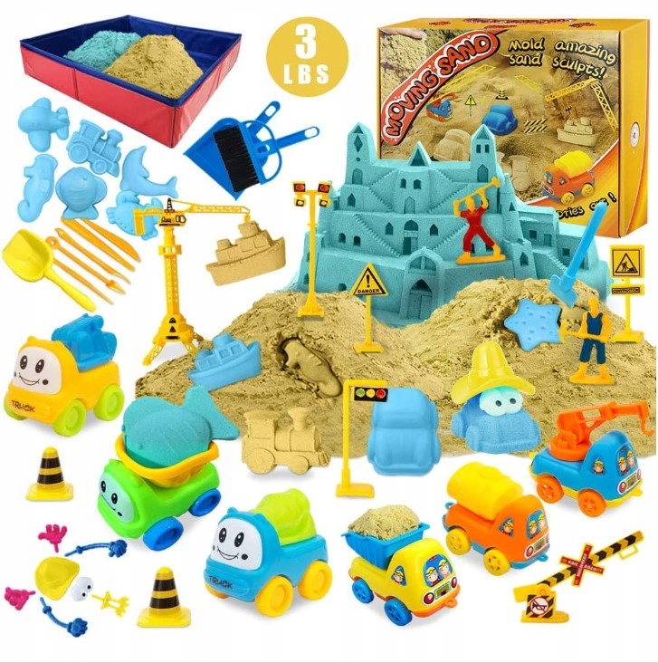 3 фунти плинного піску (по 1,5 фунта в оригінальному піску та блакитному), 6 міні-конструкторів, 1 монтажний набір (крани, фігурки, знаки, конуси та аксесуари), 10 форм для тварин, 13 інструментів для моделювання, 1 x набір інструментів для чищення, 1 x складаний. WWbudbudpiaskowpiaskow