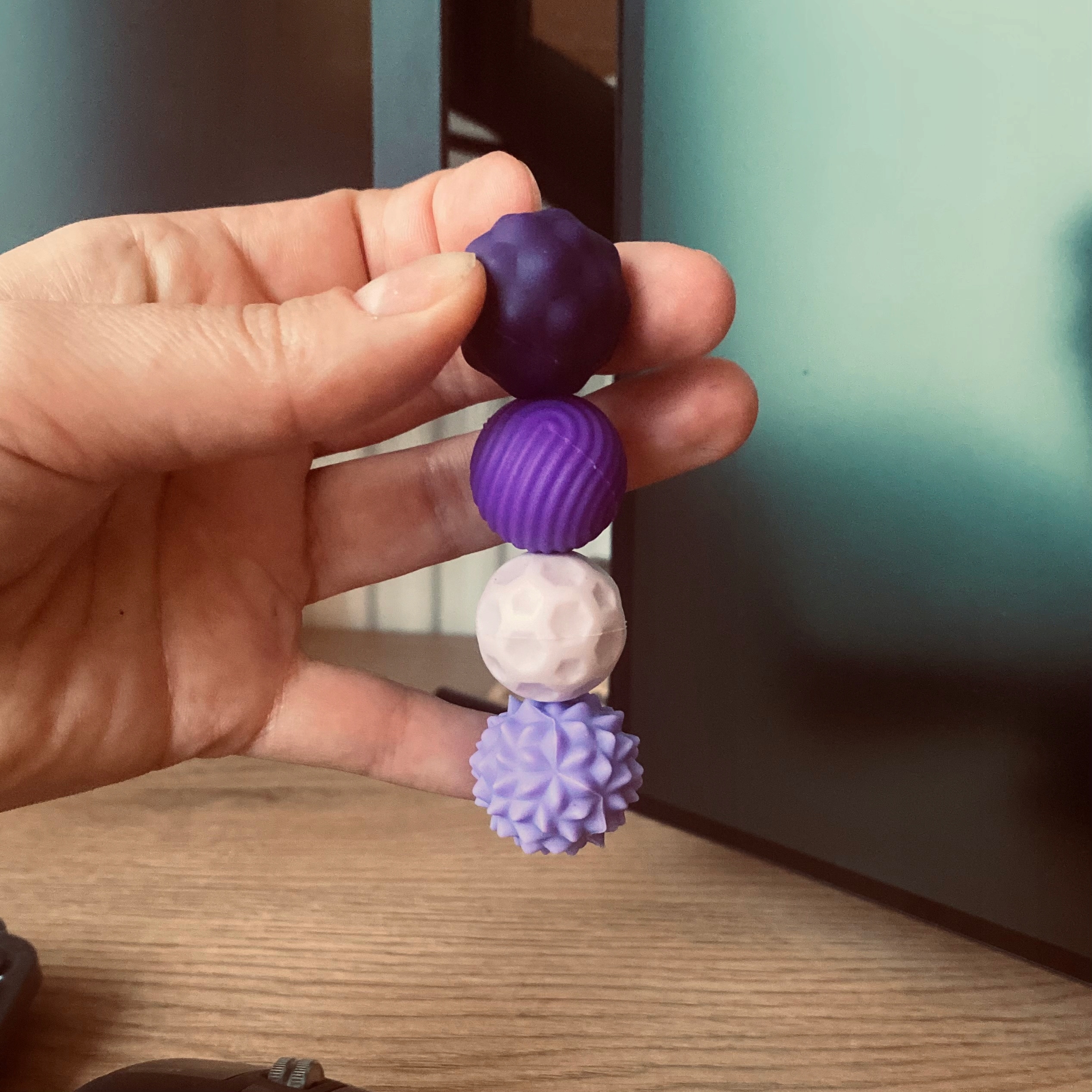 Кожна з чотирьох кульок має різну текстуру та будоващо забезпечує різноманітність тактильних відчуттів. Завдяки вбудованим магнітам їх можна вільно комбінувати, що створює додатковий релаксуючий ефект. Маніпулювання кульками допомагає зменшити нервове напруження, покращує кровообіг і підтримує уважність. Це чудовий спосіб розслабитися після довгого робочого дня або як засіб антистресової терапії.