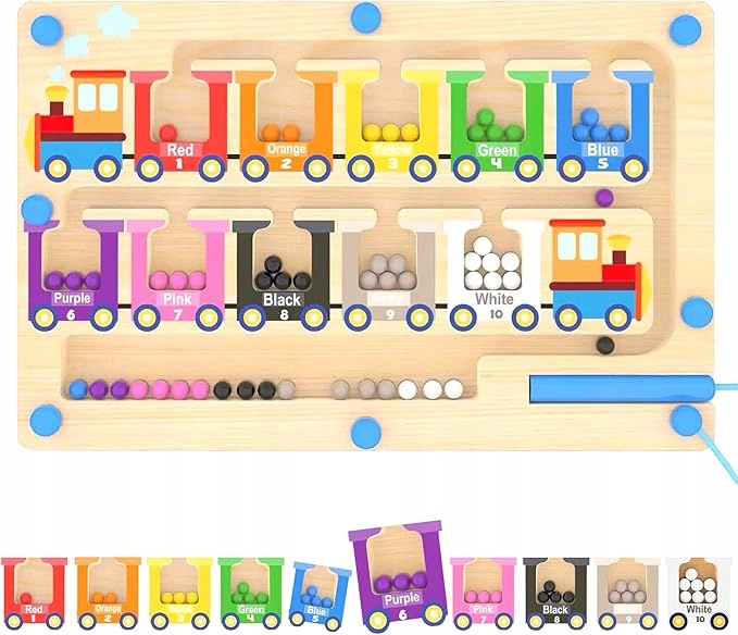 Кожен вагон потягу представляє певне число та колір. Діти пересувають магнітні кульки у відповідні вагони, розвиваючи навички рахунку, розпізнавання кольорів і логічне мислення.