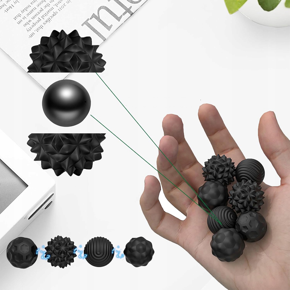【РЕЛАКСУЮЧИЙ ДОТИК】Наші магнітні кульки виготовлені з тактильного силікону та мають чотири різні опуклі текстури, щоб задовольнити різні потреби в легкій, середній та інтенсивній стимуляції, забезпечуючи нескінченні відчуття дотику під час розслаблюючого масажу, який знімає дискомфорт і стрес.
