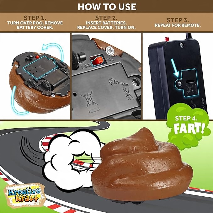 - Дистанційно контрольована фальшива купа: Сміх гарантується завдяки нашій дистанційній грі в купу. Гра супроводжується віддаленою купою, яка обертається, пердається і видає смішні звуки (потрібно 2 батареї AAA, не включені до набору)