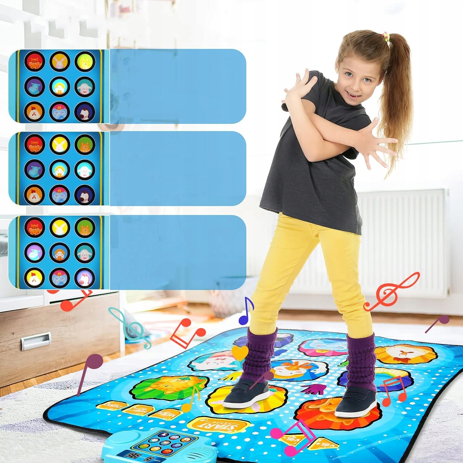 Діти можуть танцювати на електронному музичному танцювальному килимку, дивлячись на світлодіодний екран. Поєднання танцювальної гри, веселощів і динаміки дозволяє дітям не тільки відчути радість від танцю, але й потренувати своє тіло та навички реакції.