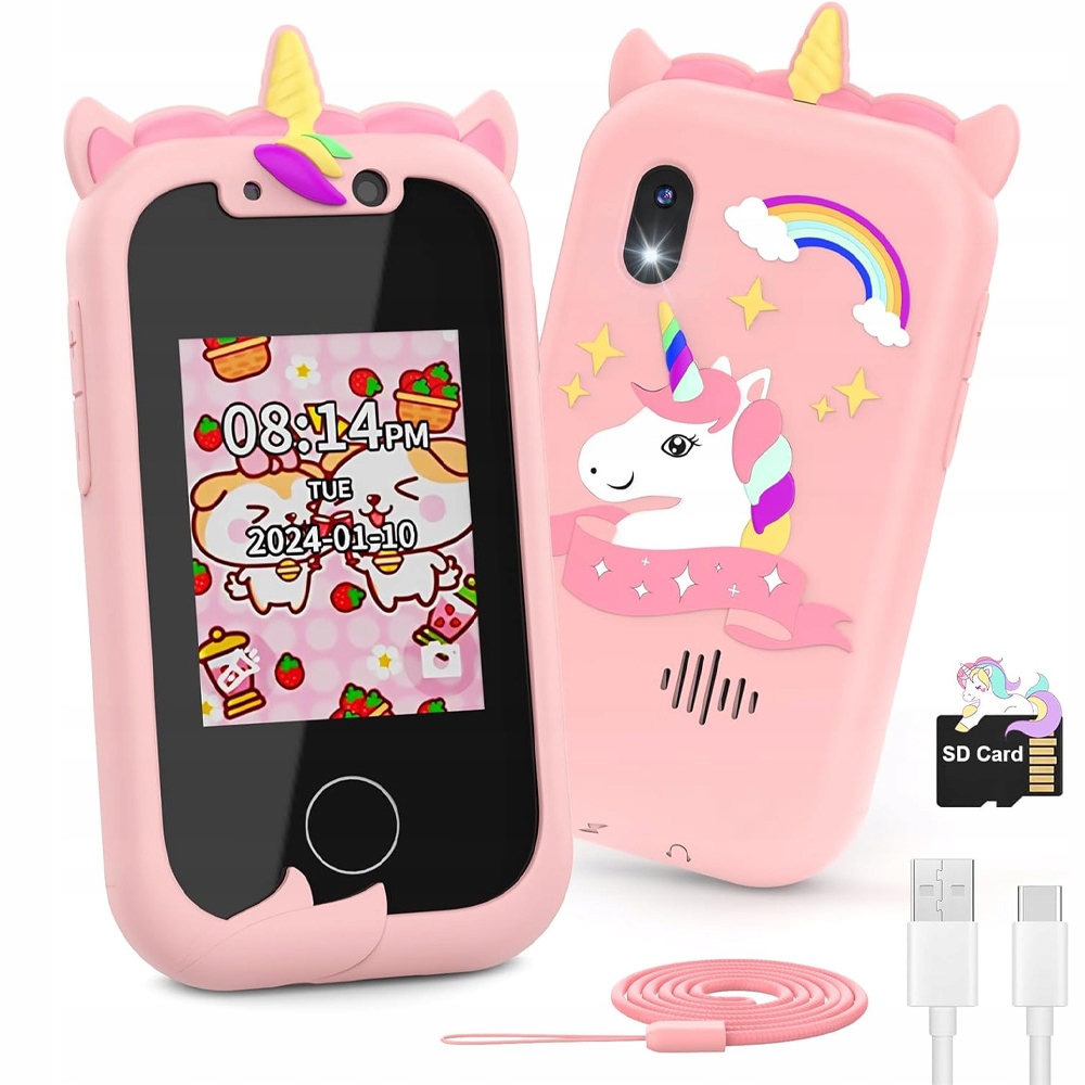 Телефон іграшок для дівчат пропонує 28 стилів шпалер та 16 шпалери для вибору робочого столу. Включає чарівний кейс силіконового телефону з єдинорічним малюнком, який стійкий до падінь і більш міцного. Невеликий і елегантний телефон, легкий у перевезенні завдяки повідку, з ефективним акумулятором 800 мАг. Ця музична іграшка може робити фотографії або слухати музику без перерви протягом 5-6 годин після повного заряду. Цей підроблений телефон - це улюблена іграшка для дівчат та хлопців у віці від 3 до 10 років та ідеальний подарунок на подорож на Різдво, день народження та для дітей.