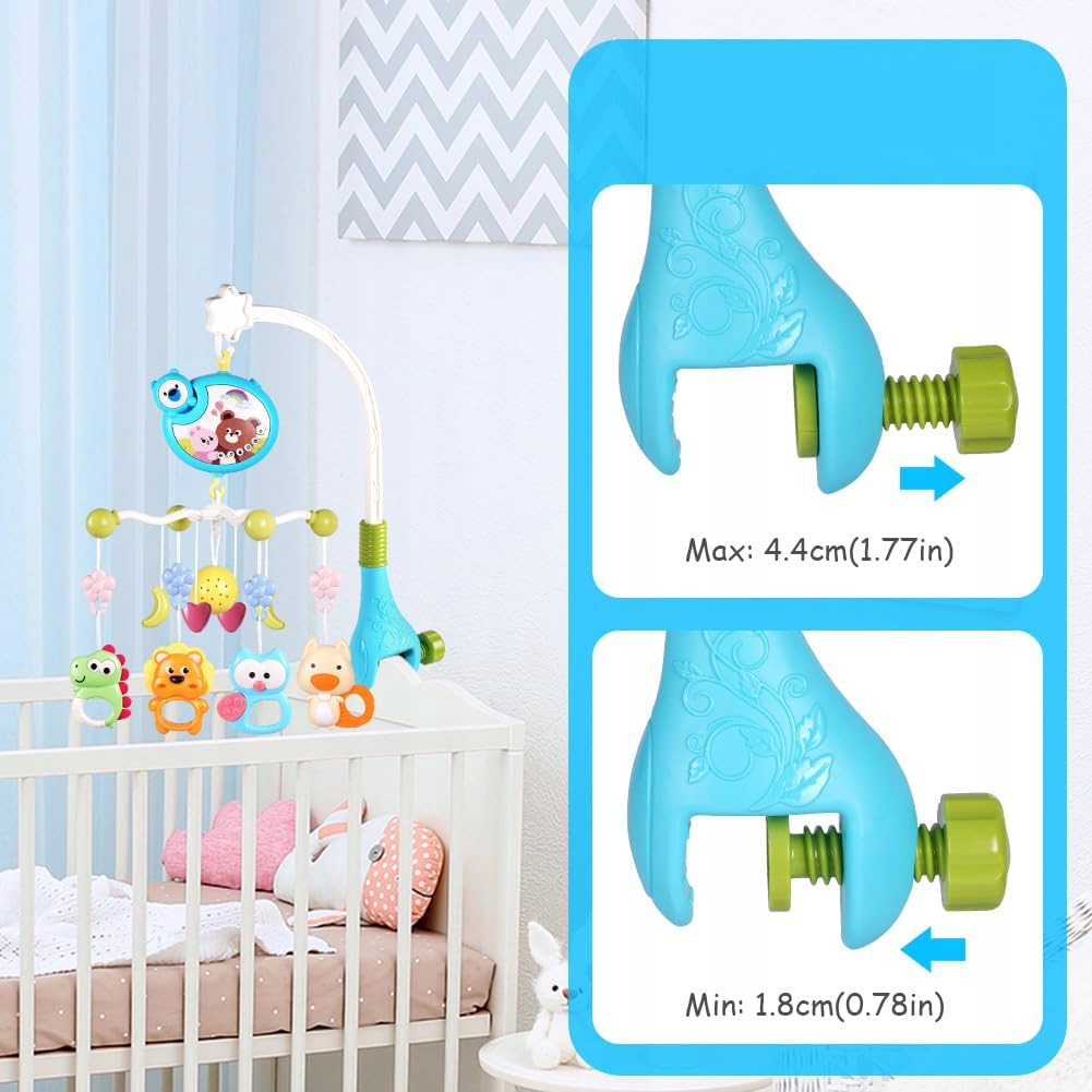 Цей мобіль на ліжечко має заспокійливий ефект колискової, нагадуючи ніжний звук дощу та синій Дунай. Гучність можна регулювати за допомогою пульта або музичної скриньки; він також служить чарівним проектором, відливаючи м’яке, приємне для ока світло на стіни або стелю, демонструючи зображення тваринного світу. Ваша дитина може дати волю своїй уяві серед цих чарівних проекцій, відчувши чудеса природи та красу музики. Його можна надійно прикріпити до ліжка.