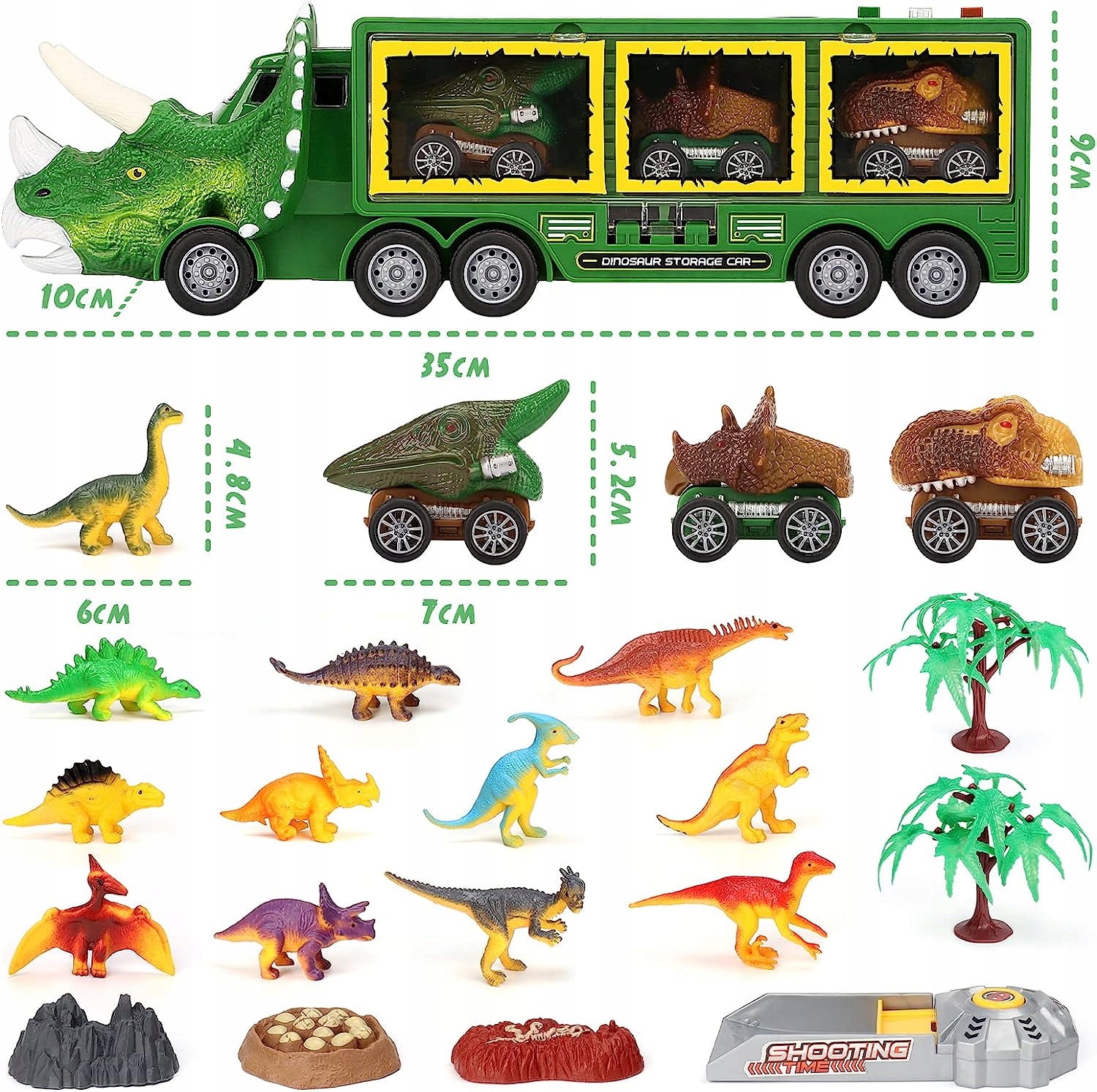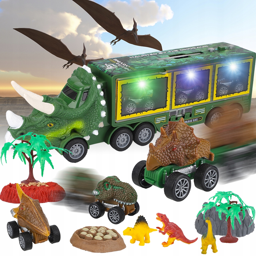 - Наш набір включає 1 вантажівку з динозаврами, 3 вантажівки з динозаврами, 12 динозаврів, 1 крутий знімний трек і 5 інших аксесуарів.