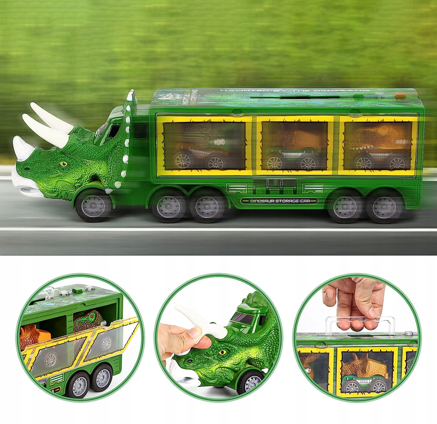 - Ці іграшки-динозаври, виготовлені з міцного пластику та м’яких рогів динозаврів, порадують вашу дитину. Ви можете зберігати всі 3 машини у вантажівці та брати їх куди завгодно.