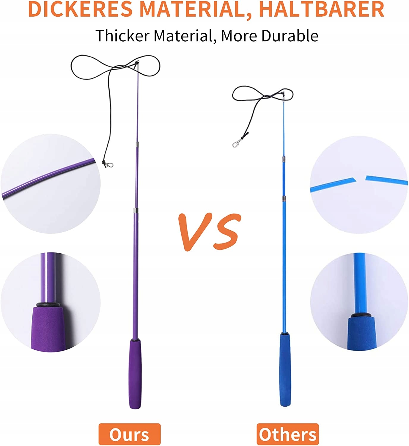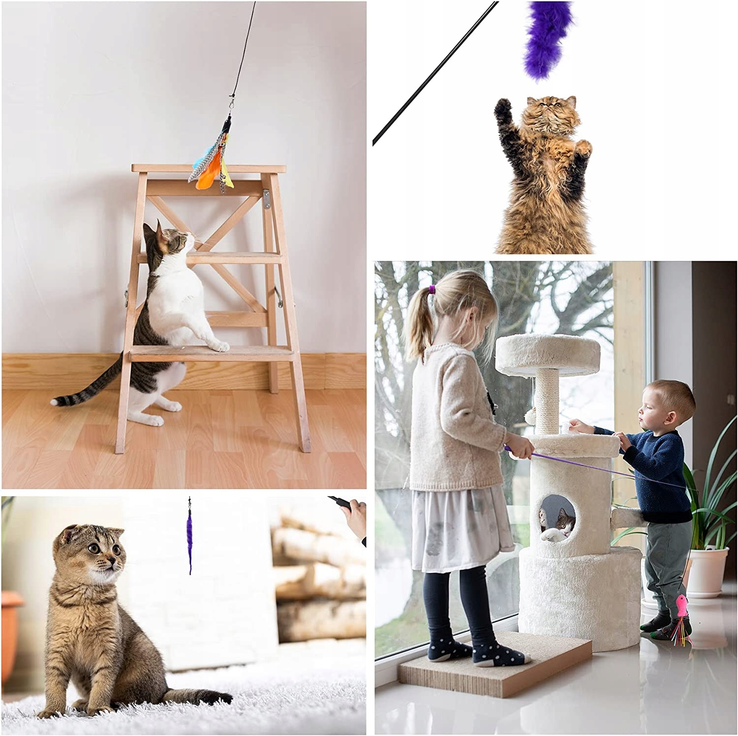 - Високоякісні, безпечні та здорові: усі іграшки виготовлені з безпечного, нетоксичного матеріалу. Натуральне пір'я надихає котячу дикість і є дружнім до котів. Телескопічна іграшка для риболовлі виготовлена з матеріалу з більшою еластичністю та твердістю, товщі та міцніші. Ручка рибальської іграшки виготовлена з піни EVA і її дуже зручно тримати. А покращений гачок на шнурку дозволяє легко міняти різні іграшки.