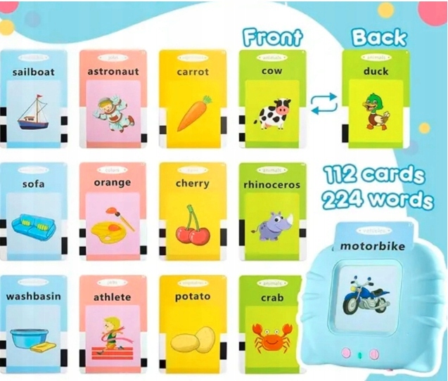 - Ми запрошуємо вас відкрити для себе захоплюючу пригоду вивчення англійської мови для дітей завдяки нашому інноваційному пристрою для читання карток. Наш набір містить 112 двосторонніх карток, на яких ви можете вивчити аж 224 слова!
