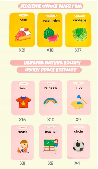 ✅112 двосторонніх карток: набір містить аж 112 кольорових карток, які представляють 224 слова англійською мовою. Це багатий словниковий запас із різних категорій.