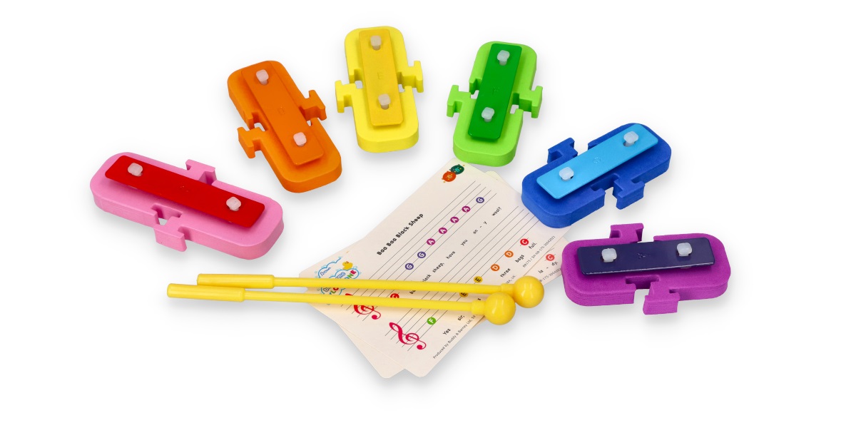 Металеві пластини прикріплені до спеціальних пінопластів, які створені для утримання вашого інструменту на поверхні води. Просто вийміть тарілки з упаковки, поставте їх на воду, візьміть палички в руки і можете починати концерт. Завдяки тому, що поролон має вирізи з обох сторін, їх можна роз’єднувати, з’єднувати та міняти місцями. У наборі також є 2 картки для відтворення мелодій типу: «Пморгни, підморгни, ось зірка». Картки зроблені з картону, тому їх слід прикріпити в місці, де вони не будуть намокати.