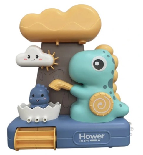 Герої іграшки — два різнокольорових динозаври та усміхнена хмаринка, які перетворять кожне купання в суцільне задоволення.