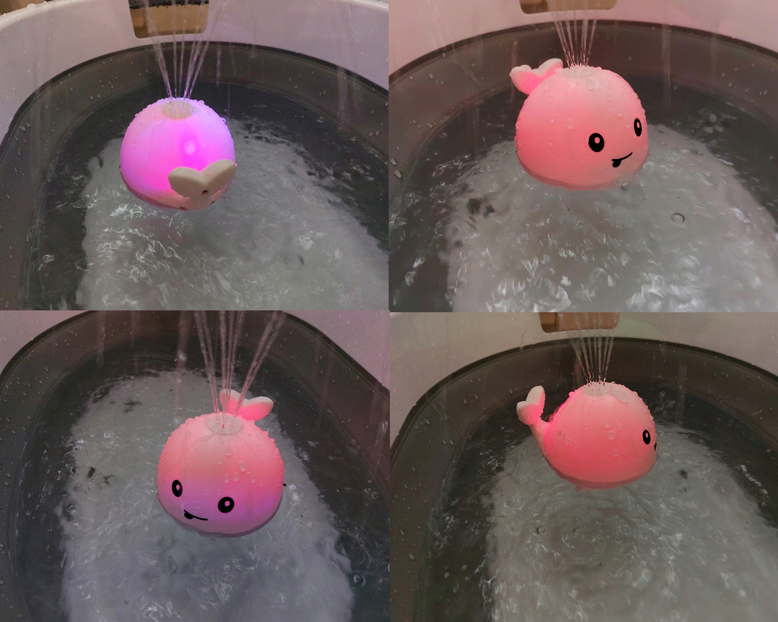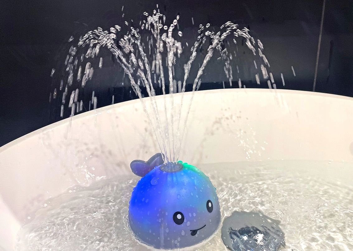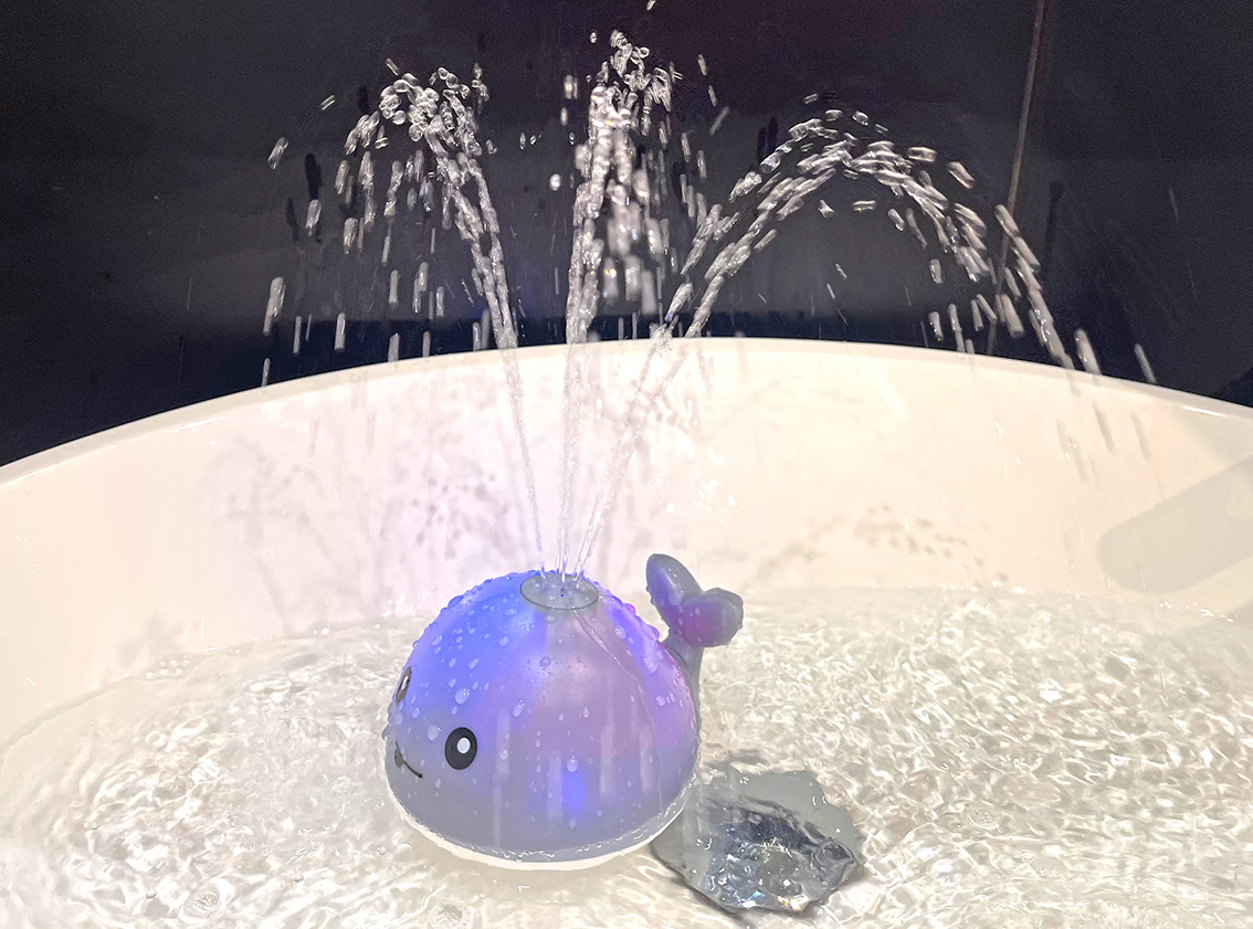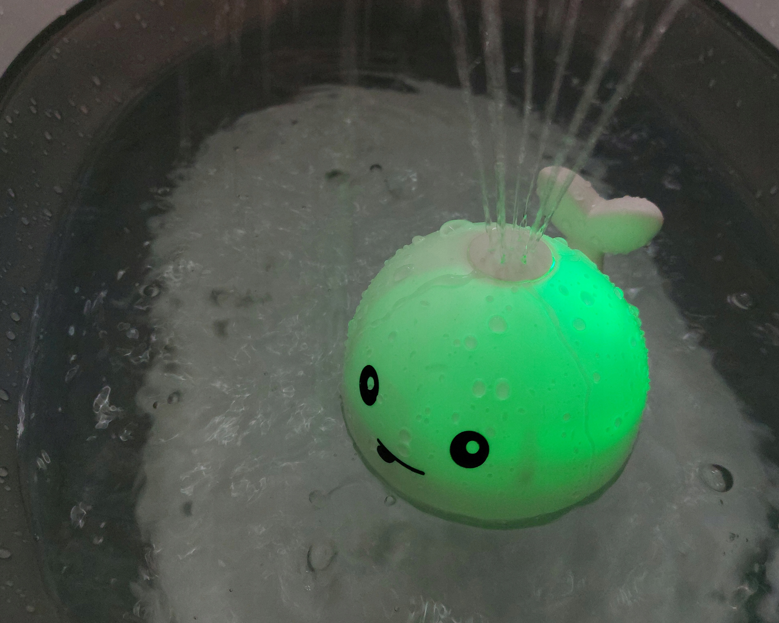 Кит, що світиться, із водою, яка бризкає, — ідеальна ідея для оригінальної гри у купання для вашої дитини.