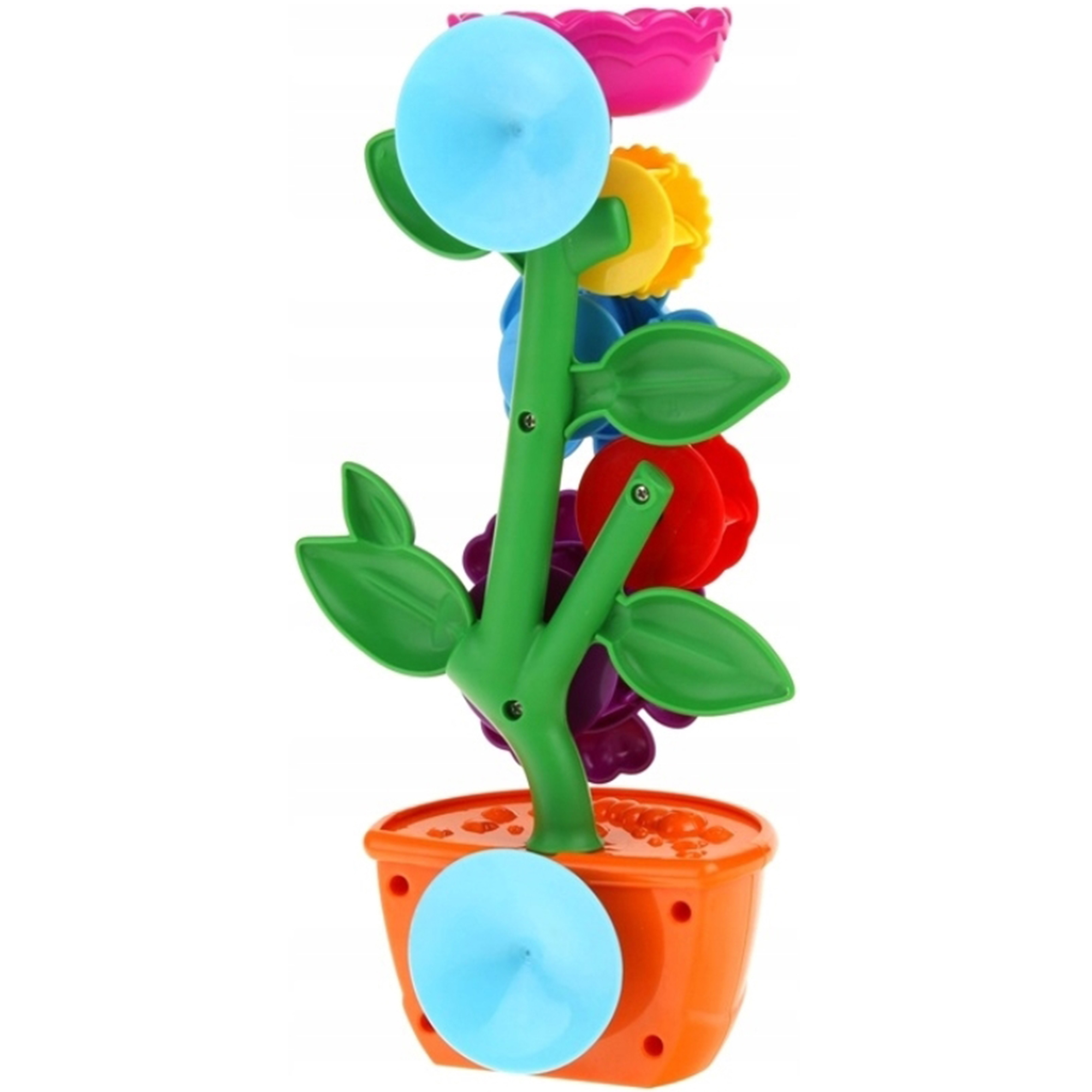 Це іграшка для кожного малюка, який любить плескатися у ванні, а також для малюка, який не любить купатися. Завдяки цьому кожне купання буде приносити задоволення, а не клопіт. Різнобарвна квітка поміщена в горщик. Наливаючи її зверху, вода стікає вниз, змушуючи квіти, що знаходяться внизу, обертатися навколо власної осі - для цього можна використовувати лійку, що входить в комплект. Ззаду набір має присоски, завдяки яким ми легко прикріпимо іграшку до плитки у ванній кімнаті на ванні, душовому піддоні чи іншому зручному для малюка місці.