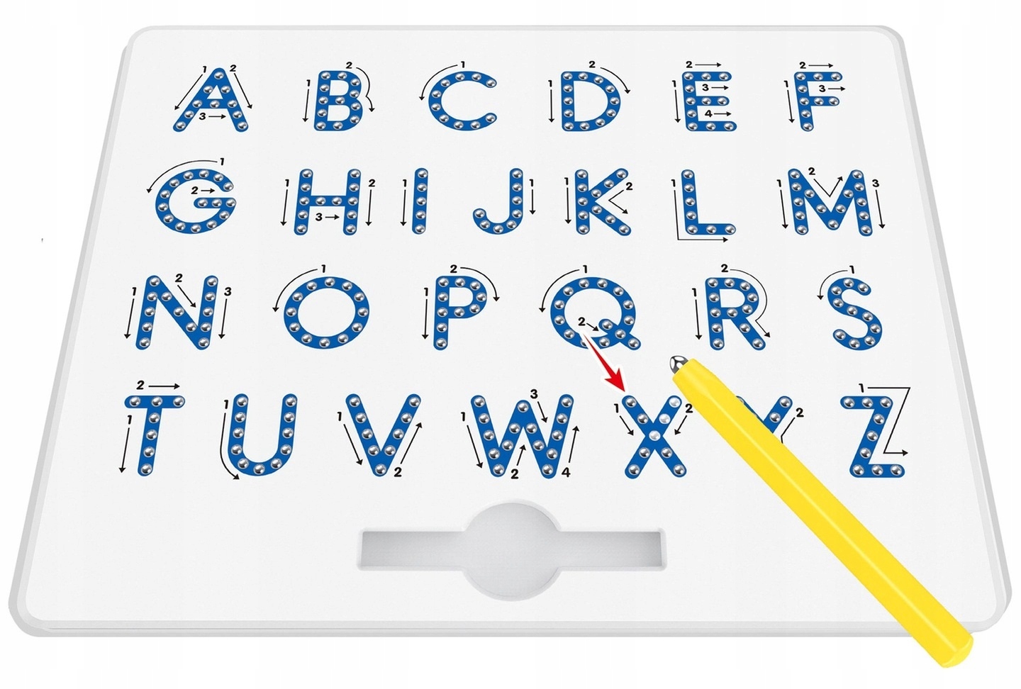Чудова іграшка для дітей від 3 років. Завдяки цій навчальній дошці діти вивчатимуть букви алфавіту, пишучи на спеціальній дошці за допомогою металевих кульок. На дошці біля літер позначені пронумеровані стрілки, вони допоможуть вказати напрямок і порядок написання літер.
