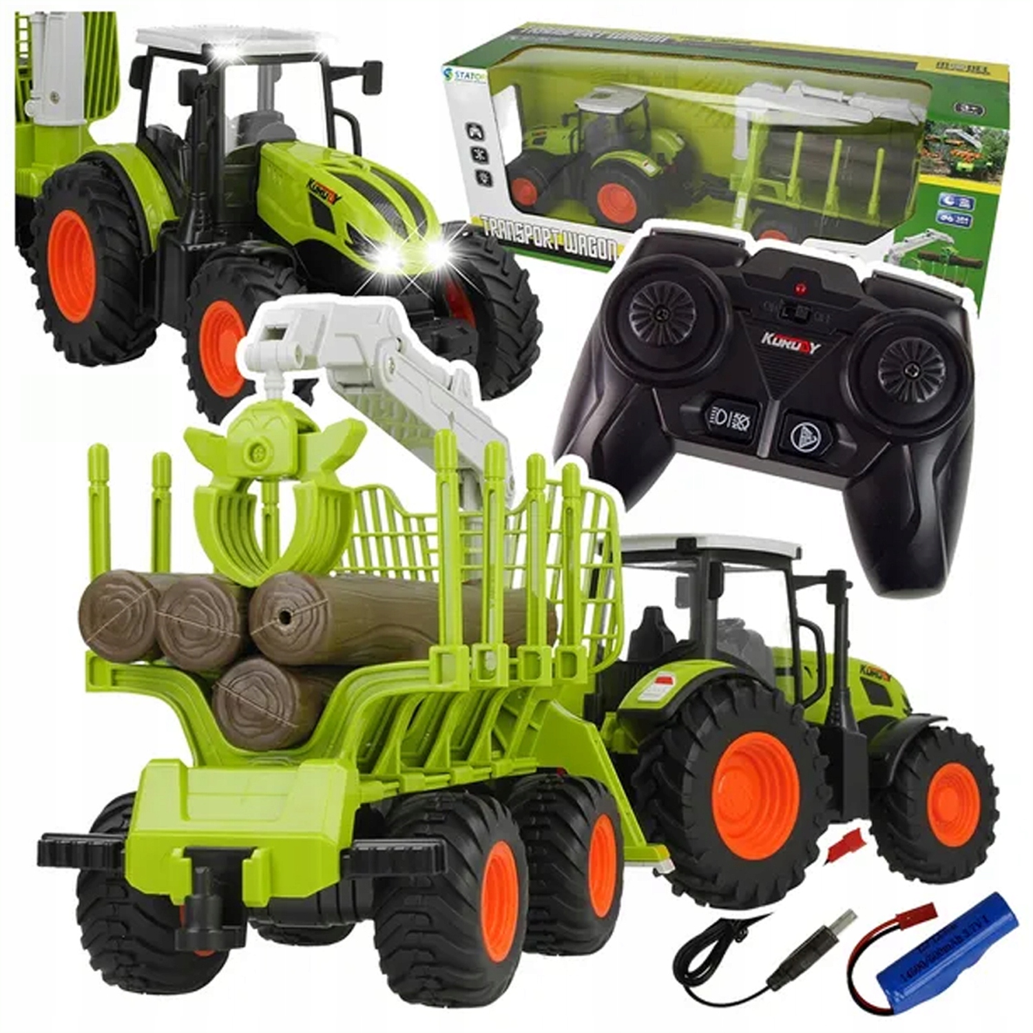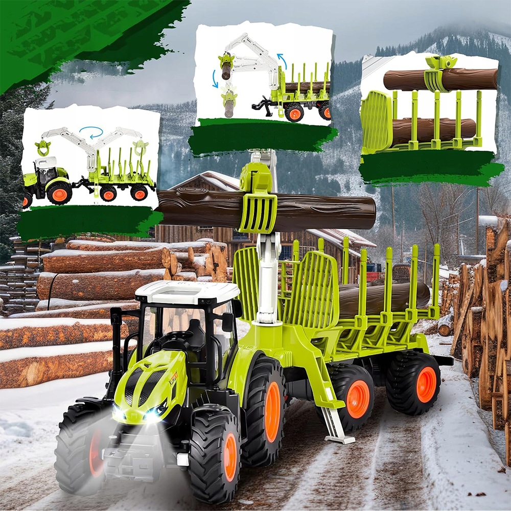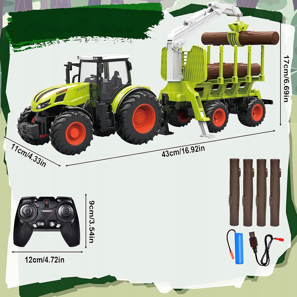 Набір, точно розроблений у масштабі 1:24, включає трактор з дистанційним керуванням, причіп із висувною підвіскою, 3 «стовбури дерев», акумулятори, пульт дистанційного керування, USB кабель для зарядки і викрутка. Готовий до гри прямо з коробки, без додаткових аксесуарів.