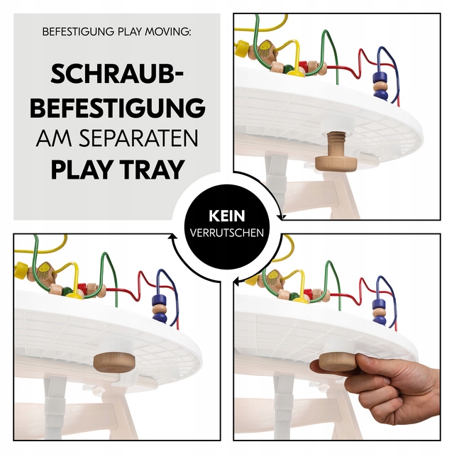 Ігровий столик швидко кріпиться до основи за допомогою дерев’яного гвинта, тому він надійно тримається на місці під час гри. Гра виготовлена з дерева, яке походить із сертифікованих лісів FSC®, і надихає красивими кольорами та чарівним, зручним для дітей дизайном. Гладкі поверхні міцної іграшки можна легко протерти вологою тканиною, якщо це необхідно.