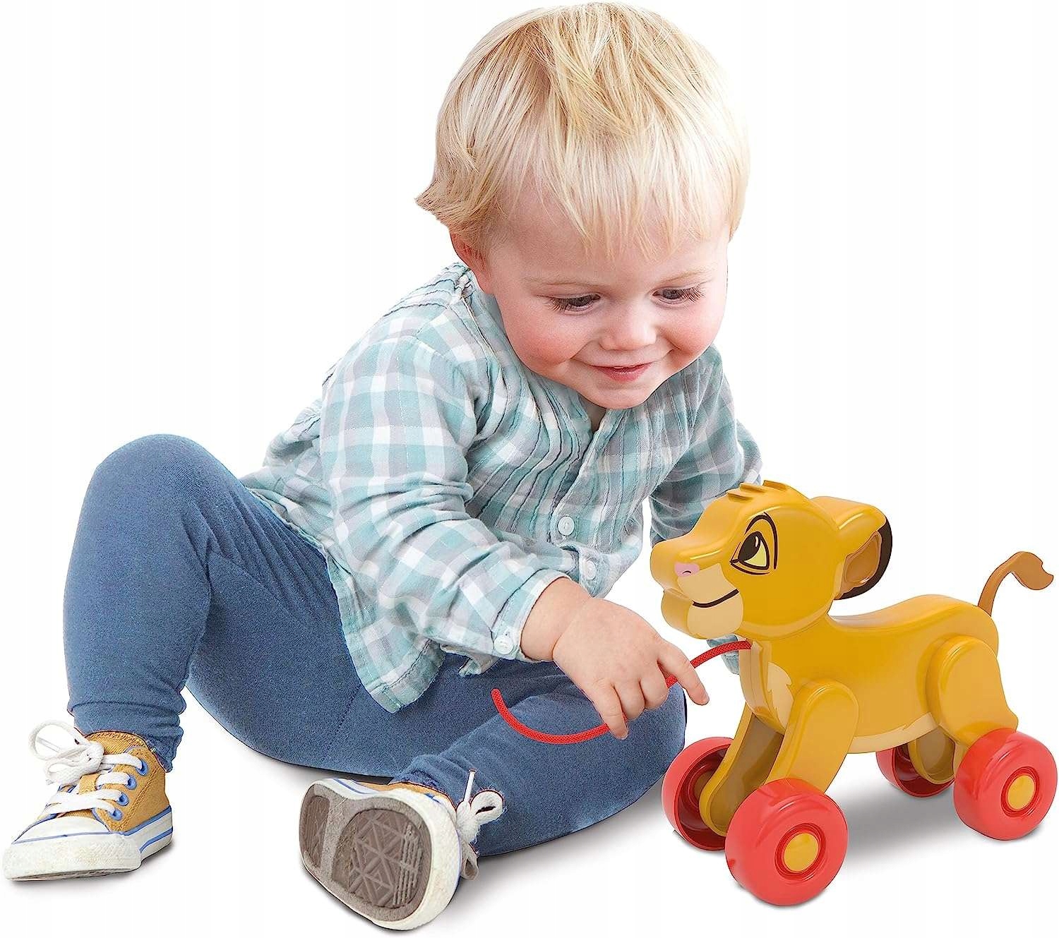 Ця чарівна іграшка-тягачка створена за мотивами відомого персонажа Діснея. «Король Лев». На ньому зображено левеня на ім’я Сімба. Він помаранчевого кольору, має хвіст, який можна рухати вручну, червону нитку та великі колеса. Продукт виготовлено щонайменше з 80% переробленого пластику.