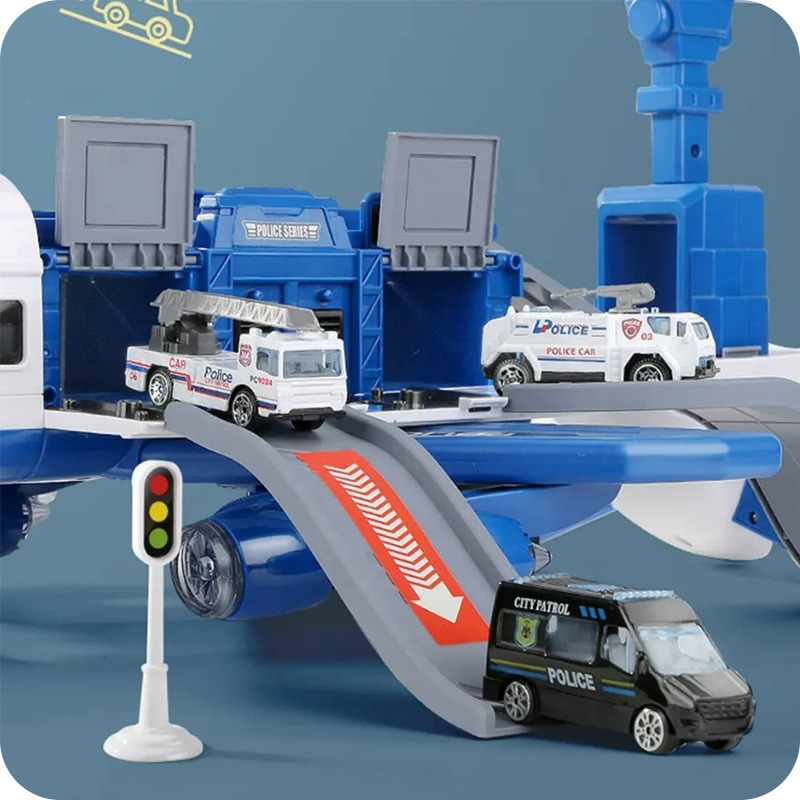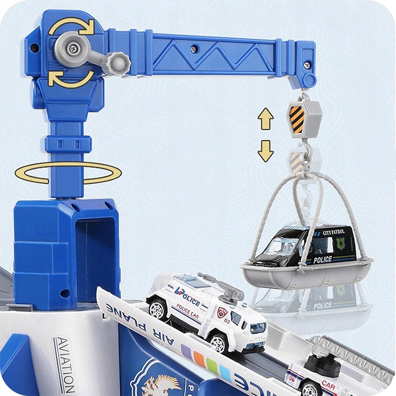 ⭐ Універсальний транспортний засіб - від аеропорту до траси: поліцейський літак - це не тільки засіб пересування, але й повнофункціональна база операцій! Дитина може відкрити фюзеляж літака, щоб завантажити машини на борт і транспортувати їх до місця дії.