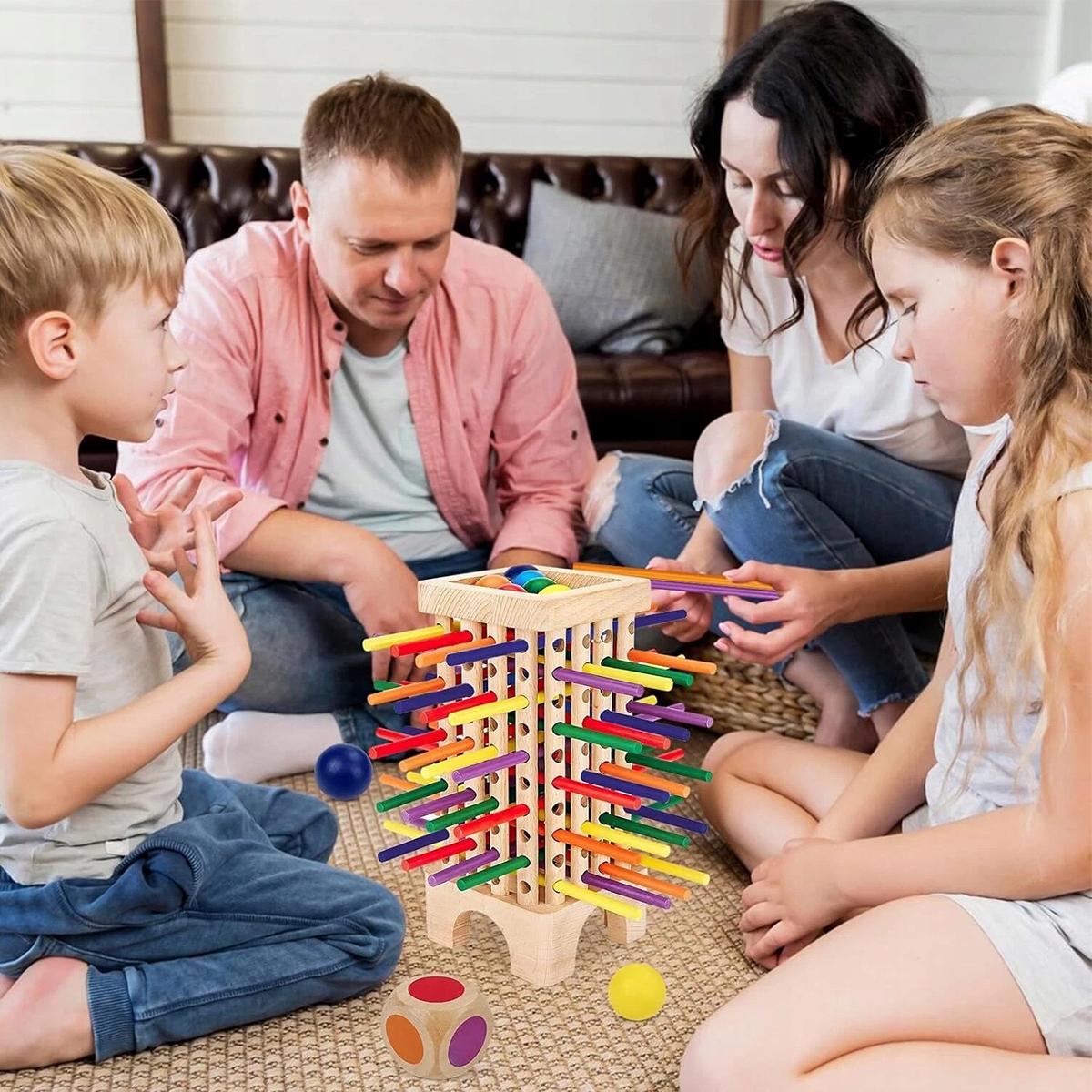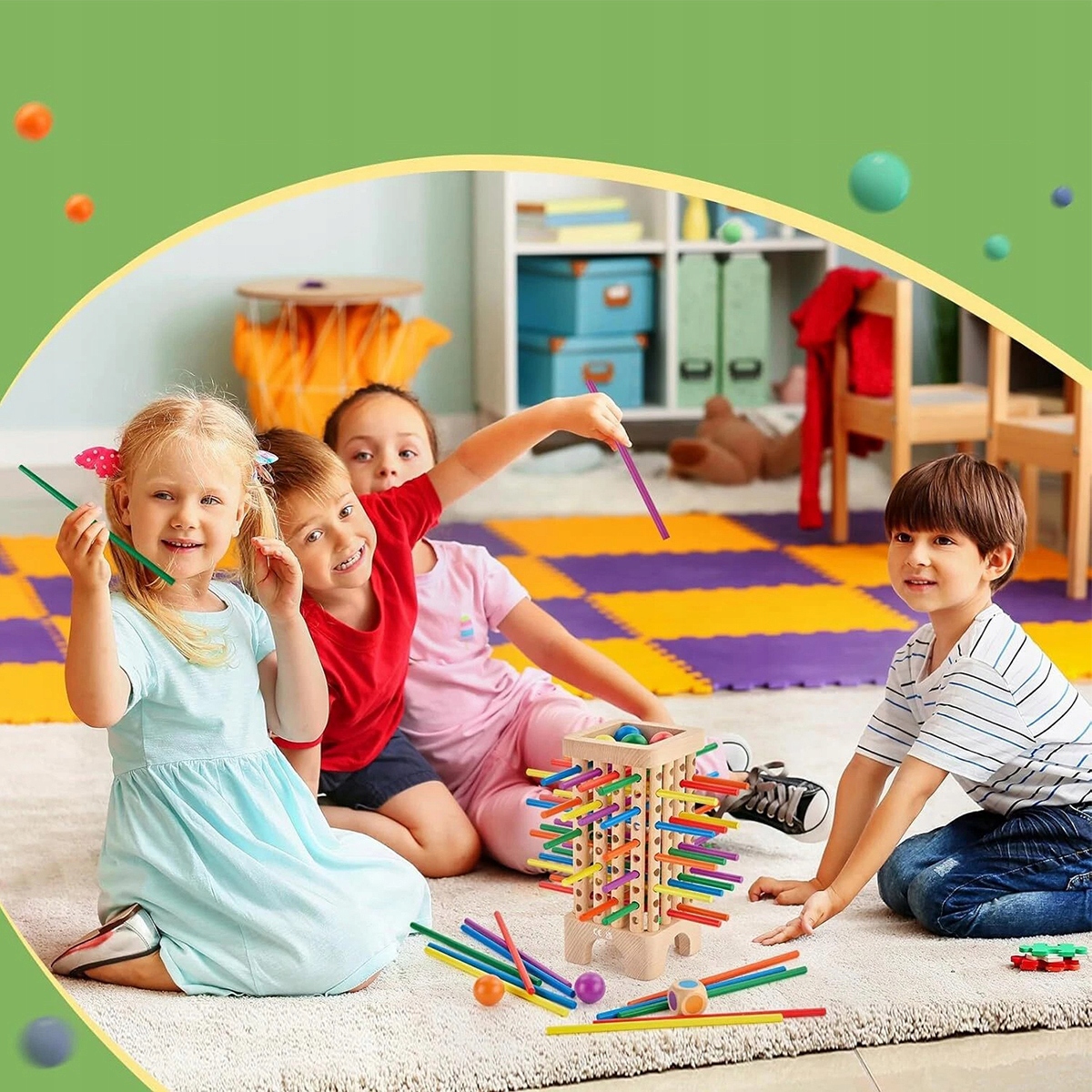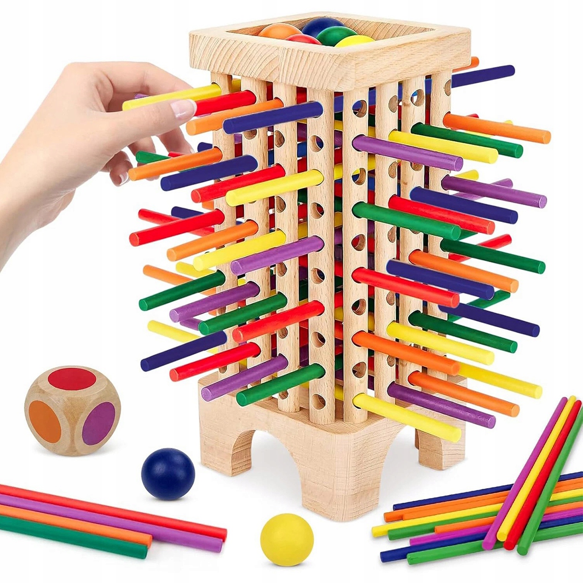 Легка гра: у цій неймовірно простій і веселій настільній грі гравці спочатку розміщують сітку з палиць над вежею та ставлять на неї дерев’яні кульки. Гравці кидають кубики і по черзі дістають палички, намагаючись не допустити випадання кульок. Перемагає гравець, у якого випало найменше м'ячів! Ці прості правила не тільки розвивають навички дітей, але й роблять гру з друзями дуже веселою.