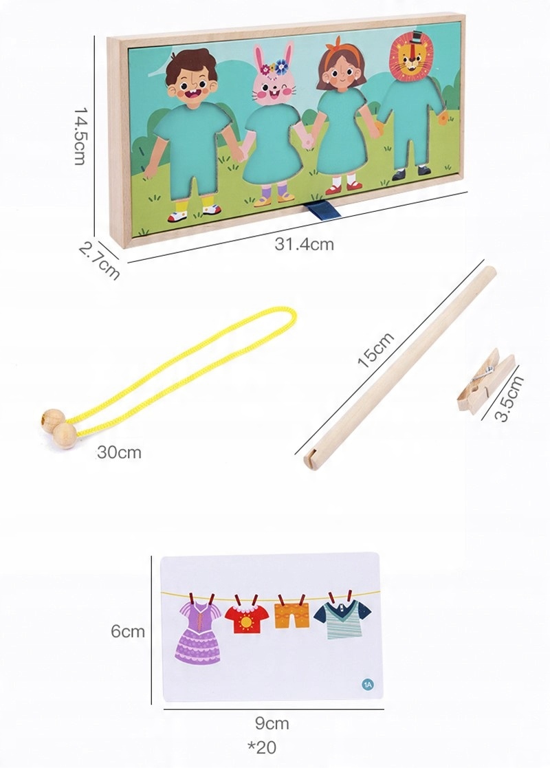 Дошкільнята, розвішуючи білизну за допомогою маленьких дерев'яних затискачів, вправляються у правильному хваті, що так важливо для подальшого навчання письма. Крім того, стежачи за порядком розвішування одягу, розвиває сприйнятливість, координацію рук і очей і орієнтацію в просторі.