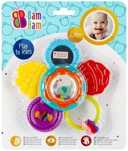 БАМ БАМ квітка-присоска, розвиваюча іграшка для дітей від 0 м+. Квітка встановлена на поворотній платформі. В результаті обертання платформа видає ніжні, брязкітливі звуки завдяки різнокольоровим кулькам, розміщеним всередині квітки. Пелюстки квітів з різними текстурами, візерунками та кольорами, які обертаються та поглинають увагу дитини, активізуючи її зір, дотик і слух. Присоска під іграшкою забезпечує надійне кріплення до стільниці, підносу в колясці або стільчика для годування. Розміри/вага/батарейки: розміри продукту (ширина x висота) [см]: 15x15 розміри упаковки (довжина x висота x глибина) [см]: 20x24x8, вага продукту без упаковки [кг]: 0,11 кг, вага продукту в упаковці [кг]: 0,15 кг, не потребує батарейок. Іграшка призначена для дітей від 0м+. Упаковано в блістер.