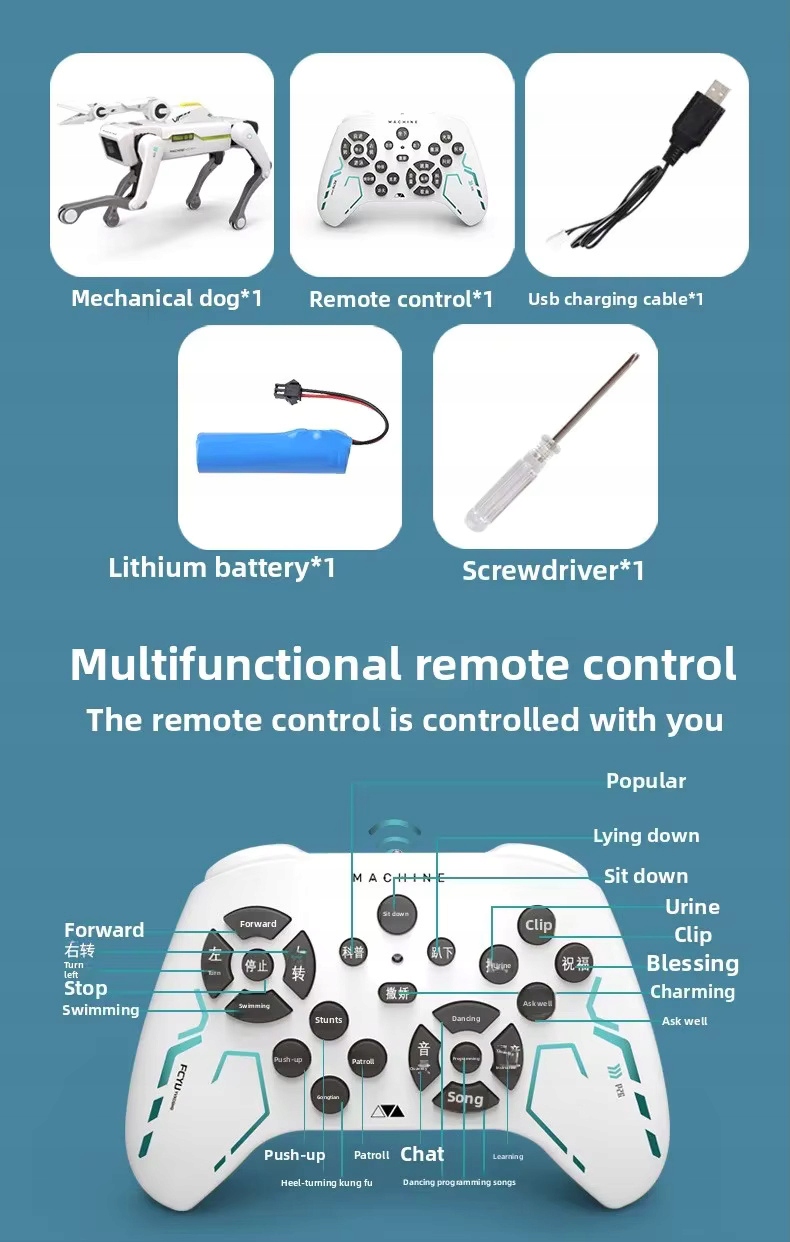 Розумна собака використовує 1 незнімну літієву батарею 3,7 В, а пульт дистанційного керування використовує 3 × 1,5 В «ААА» неперезаряджувані батареї.