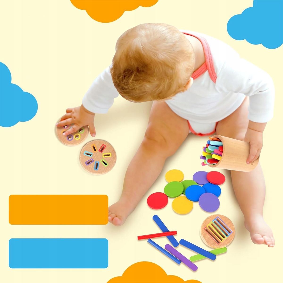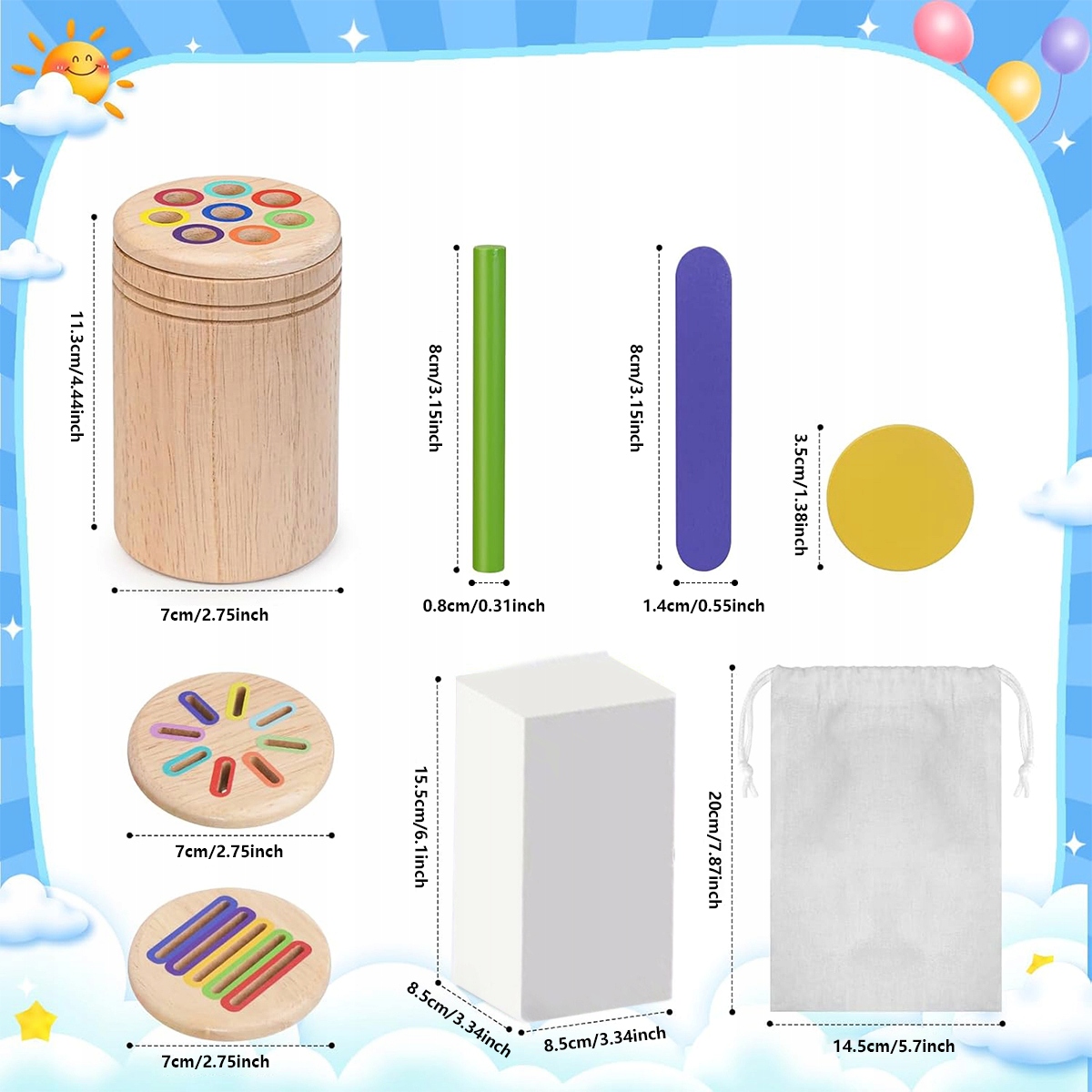 - Іграшки для навчання та розвитку малюків: дерев’яна трубка з 3 видами кришечок, 16 різнокольоровими паличками, 16 паличками для морозива та 10 кілець — класичний подарунковий набір для дітей дошкільного віку. Він підтримує сприйняття кольорів, просторове сприйняття дитини, уяву та інновації, а також допомагає контролювати точні рухи та розвивати почуття орієнтації. Кришка, що відкривається, допомагає дітям зрозуміти довговічність об’єктів і причинно-наслідкові зв’язки.