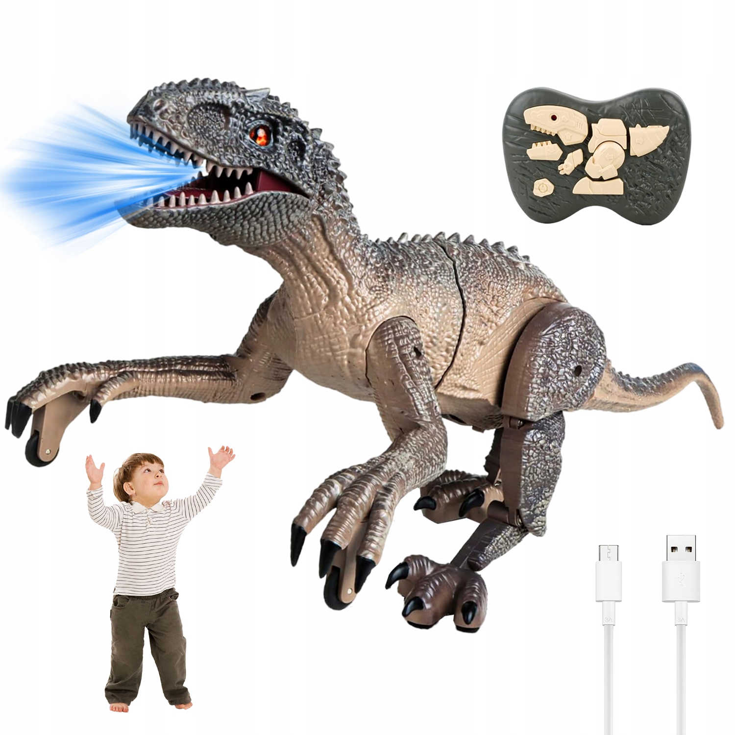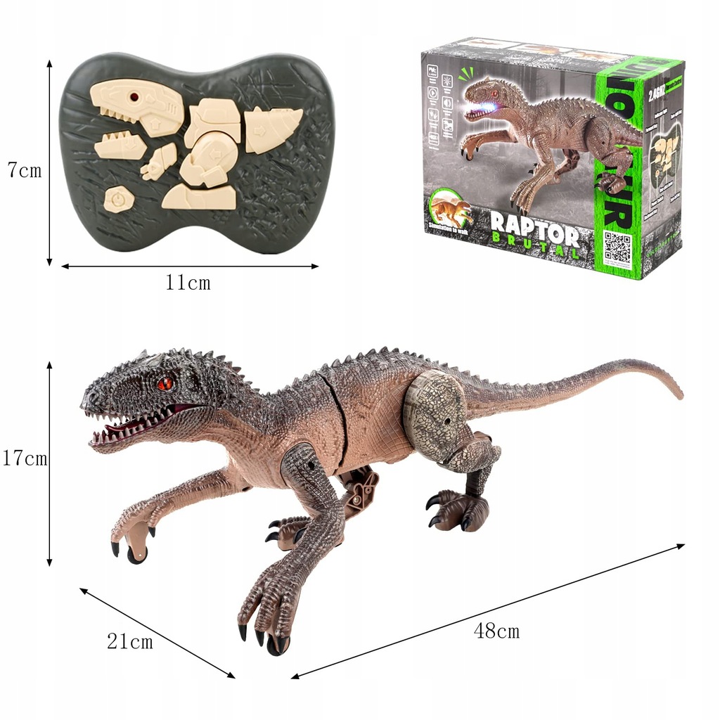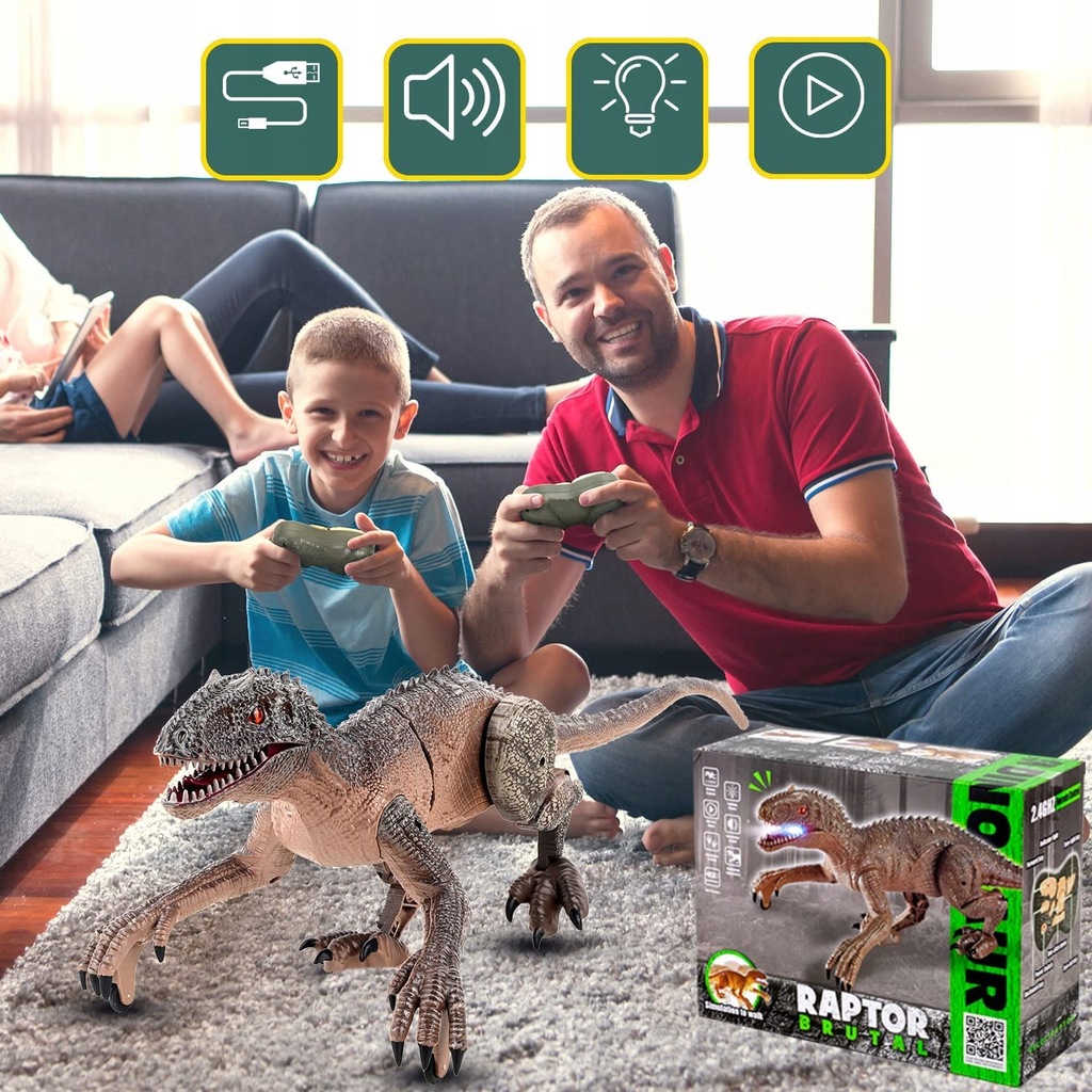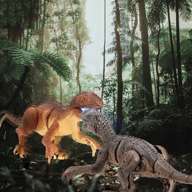 Вишуканий пульт дистанційного керування у формі скам’янілості робить керування дуже простим. Іграшка-динозавр може рухатися вперед/назад, обертатися вправо/вліво і одночасно видавати гулкий звук. Кнопка «One Click Demo», динозавр на дистанційному керуванні виконує певні дії. Це ніби справжній велоцираптор, який біжить перед вами. Дозвольте своїй дитині відчути пригоду Юрського періоду!