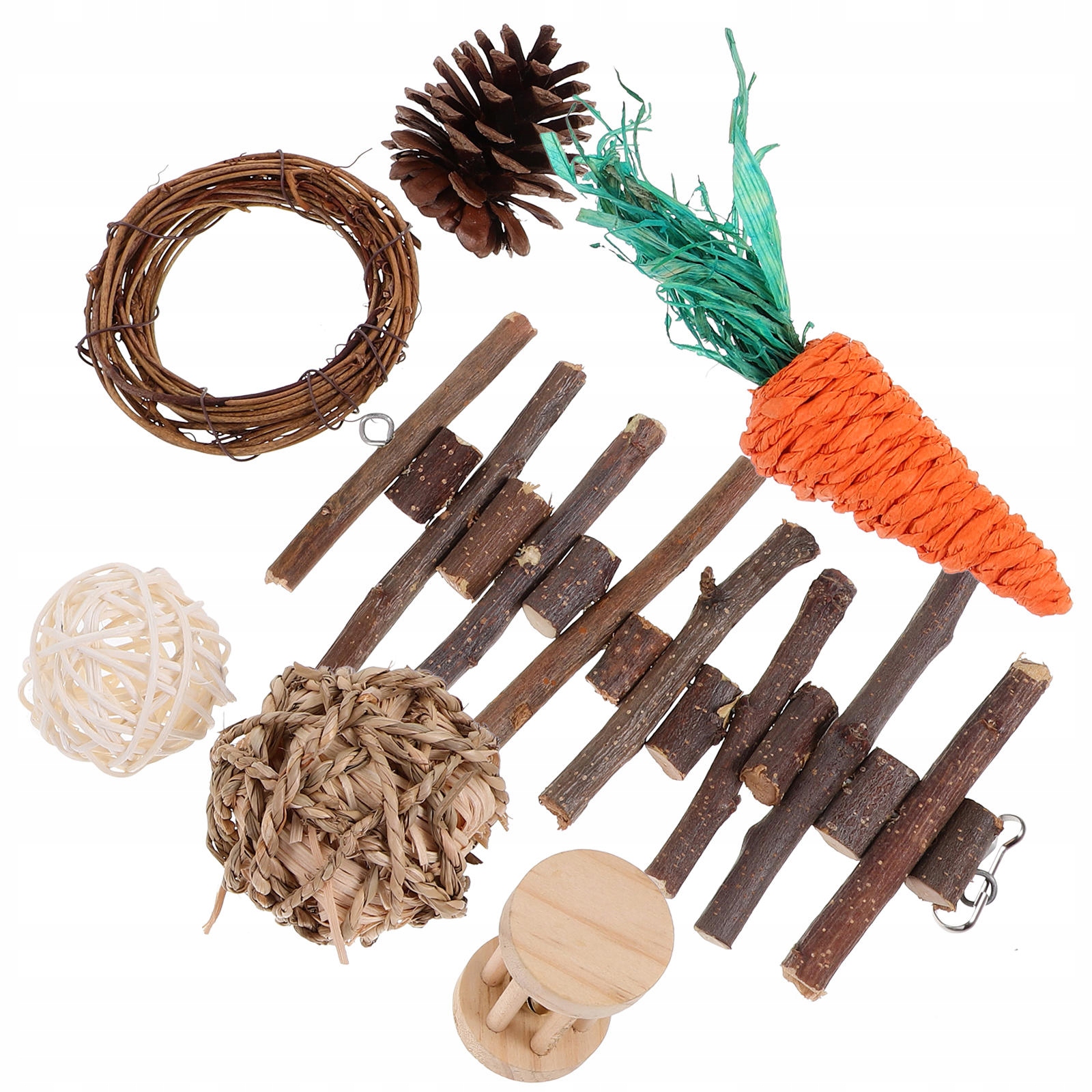 ✅1 x Деревна паличка з довгою дерев’яною 1 x Кільце 1 x Маленький барабан 1 x Морква 1 x Раттен 1 х соснова конус 1 x Тканий куля з соломи