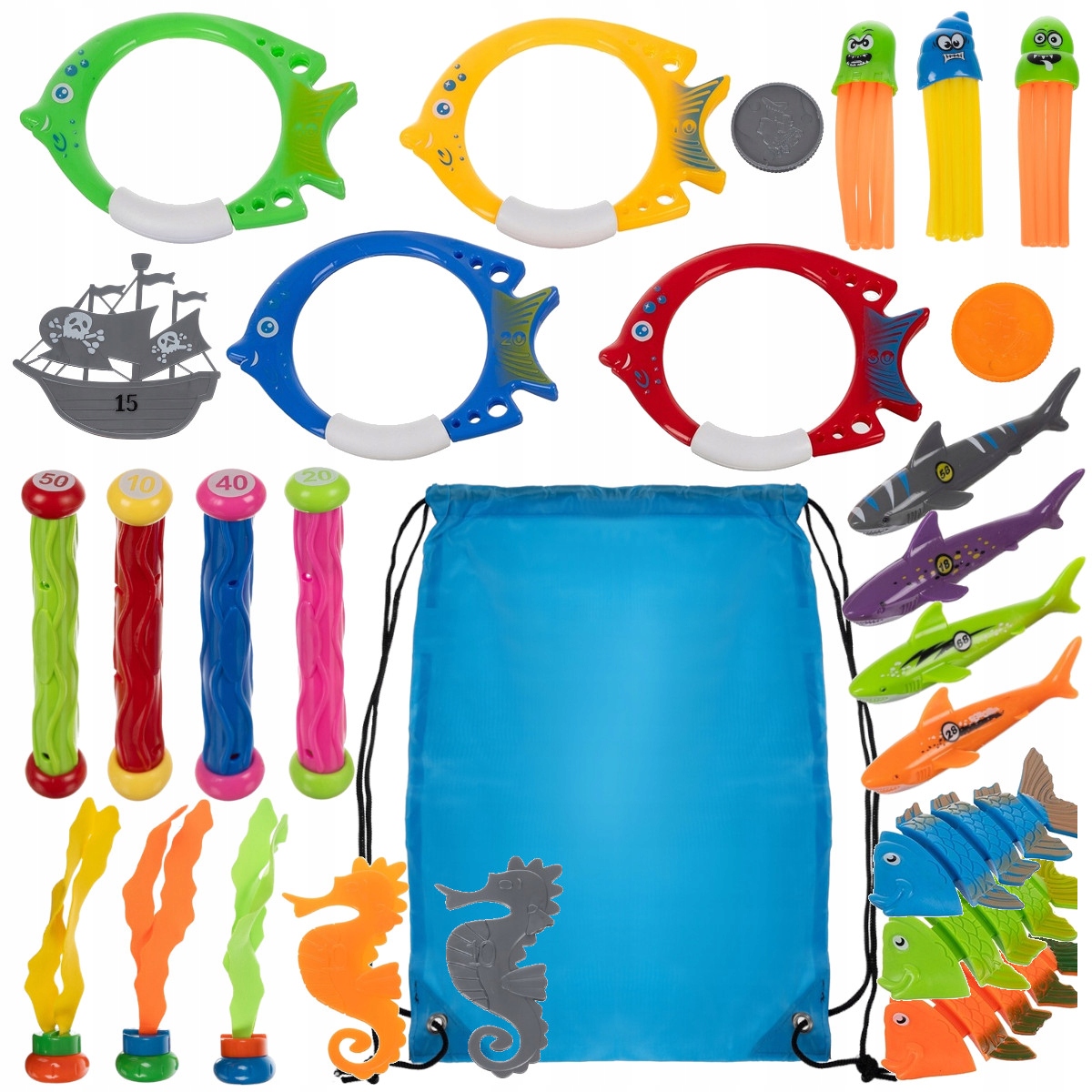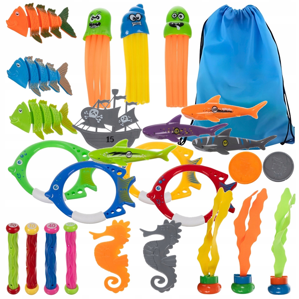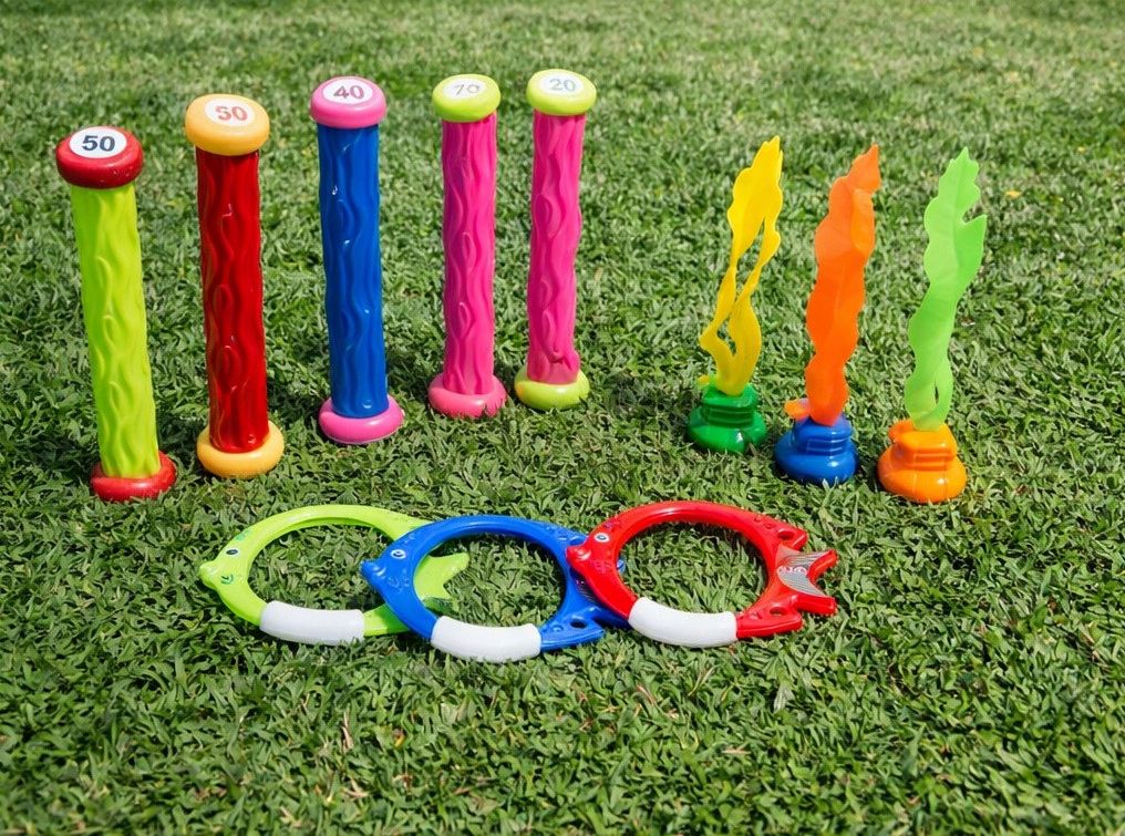 Іграшки виготовлені з високоякісних матеріалів, що гарантує довговічність і безпеку під час гри. Ретельна робота та яскраві кольори роблять їх видимими під водою.