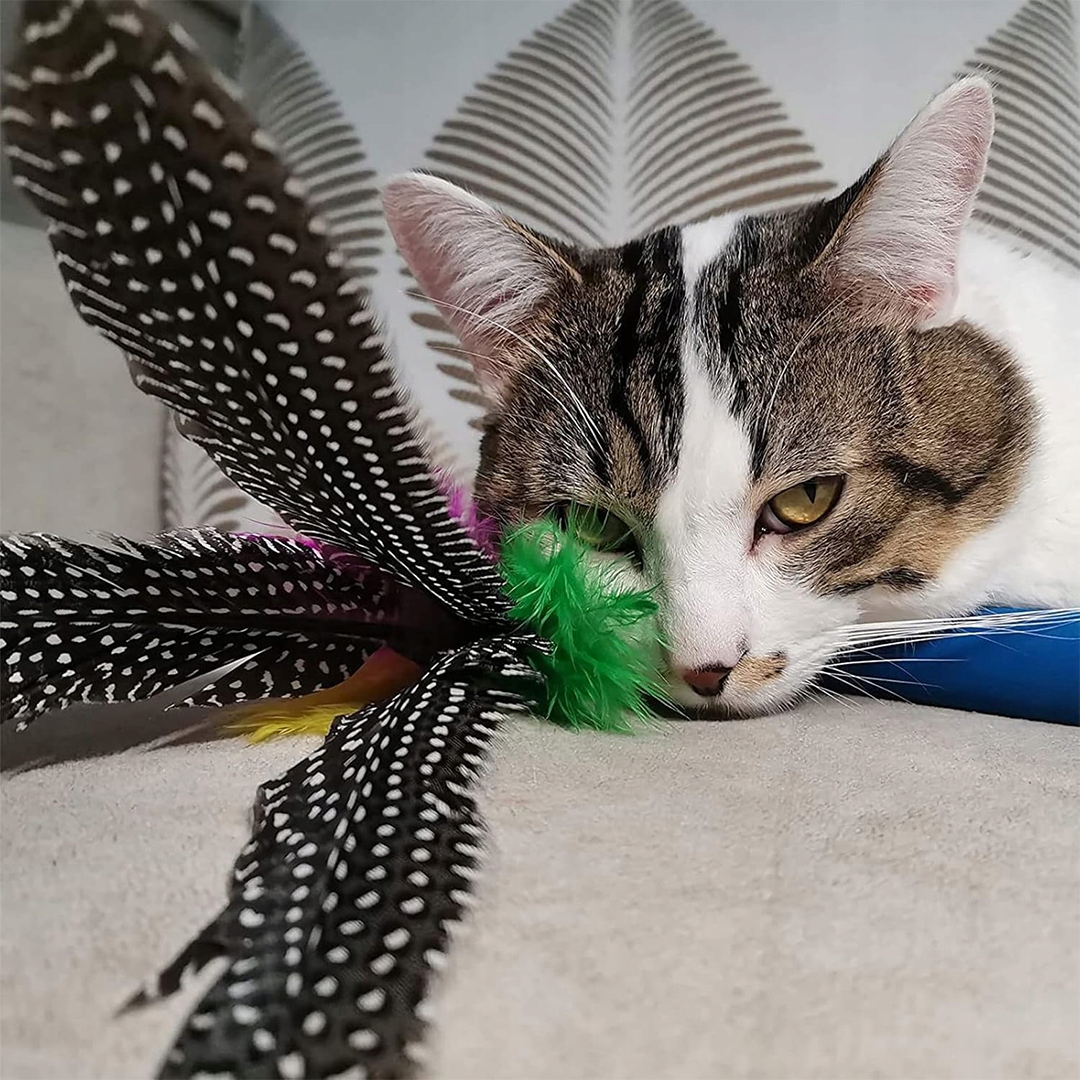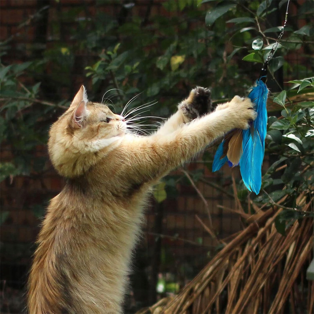 Набір прикріплений до інтерактивного стрижня з підвіскою з пір’ям і дзвонами . Це прекрасний спосіб зіграти разом і будувати зв’язки з вашим вихованцем.