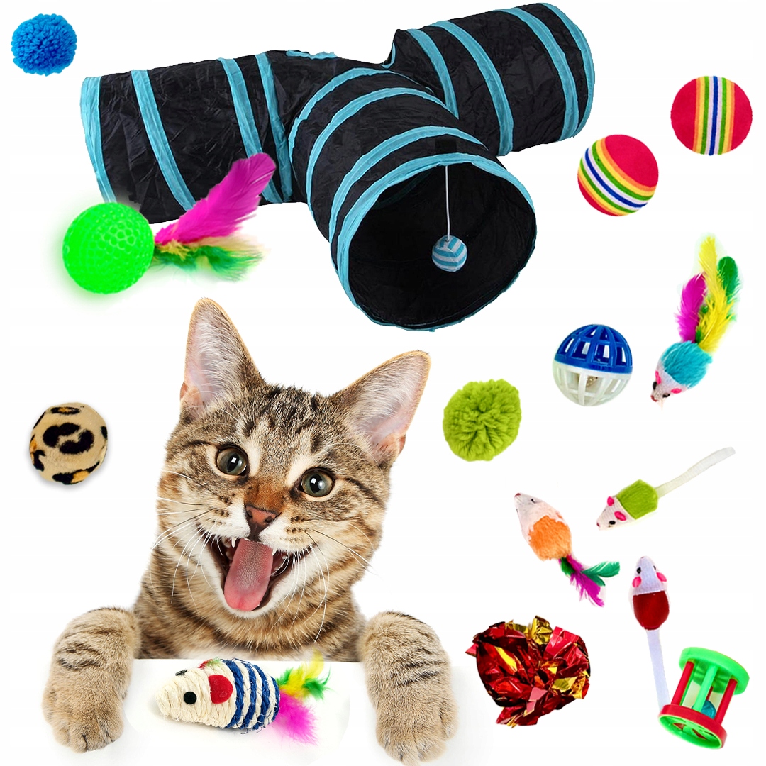 🐱 Набір іграшок для елементів CAT 21 + T -укладений тунель. Барвисті кульки, миші, помпом, стрижня з пір’ям і, перш за все, великий тунель з у формі T -зробить вашу кішку щасливою, вибігаю та щасливою .