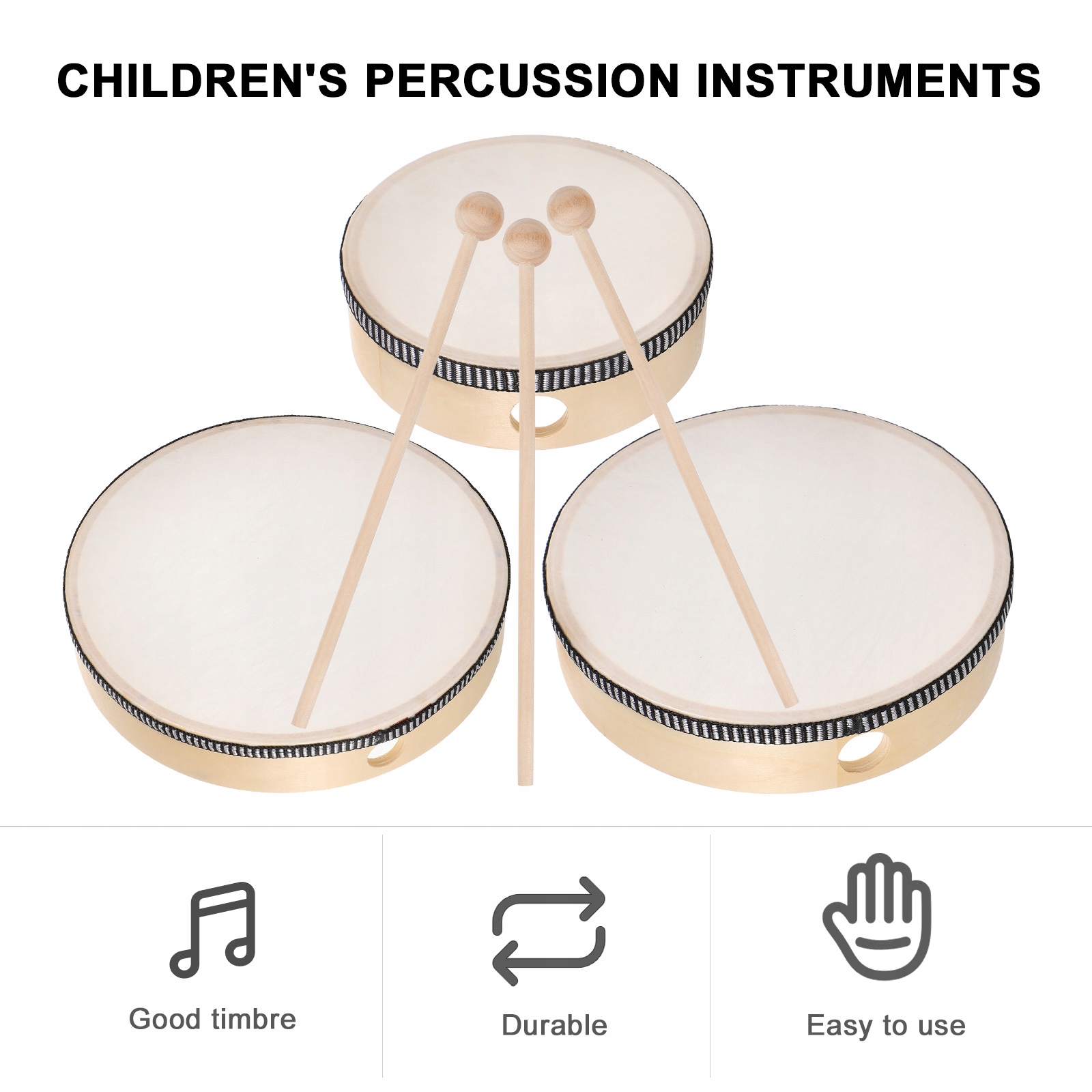 Поставляйтеся з барабанами різних розмірів, кожен із яких постачається з барабанною паличкою.