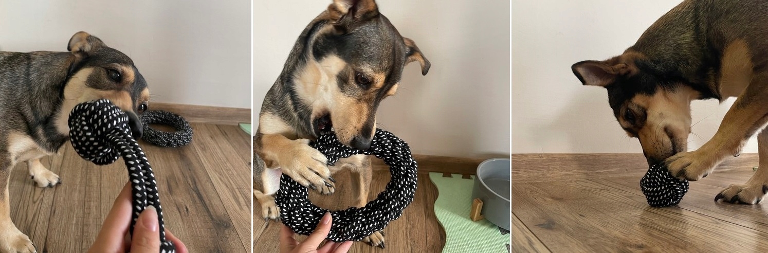 Набір із 10 іграшок для собак — це ідеальне рішення, яке забезпечить вашим вихованцям різні форми розваг і діяльності. У набір входять три різні ривки - з двома петлями, з кулькою і з вузликами. Ці іграшки виготовлені з міцної чорно-білої мотузки, яка не тільки привертає увагу собаки, але й робить їх міцними та стійкими до пошкоджень. Додатково в набір входить плетений прорізувач у формі клаптя, кулька і кільце діаметром 17 см, які надають собаці різноманітність і нові стимули для гри.