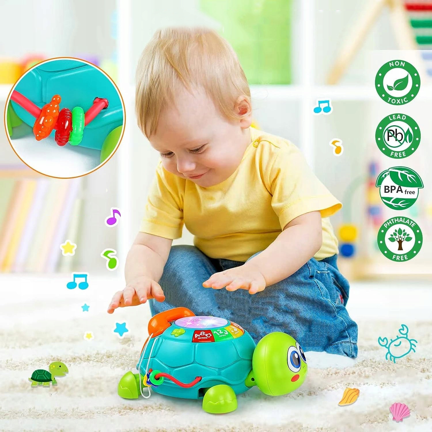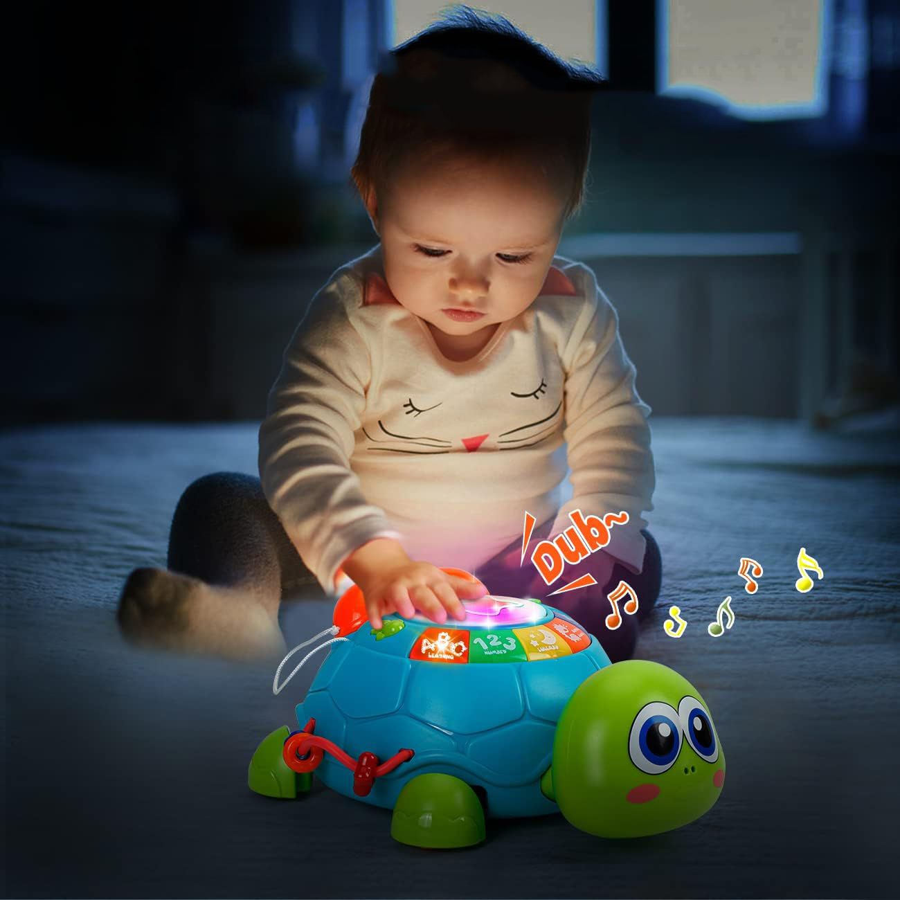 🐢🐢🐢【Мене хвилює найважливіше】Здоров'я та безпека вашої дитини є пріоритетом кожної матері - ми розуміємо вашу стурбованість! Ця іграшка у формі черепахи, виготовлена з ударостійкого АБС-пластику та не містить бісфенолу А, має гладкі закруглені краї для безпеки вашої дитини. М'яке освітлення захищає чутливий зір, а заспокійливі звуки приємні на слух. Потрібні 3 батарейки ААА (не входять в комплект). Ідеальний подарунок для хлопчиків і дівчаток 0-12 місяців, які вміють сидіти і повзати, і ідеальний подарунок на перший день народження.