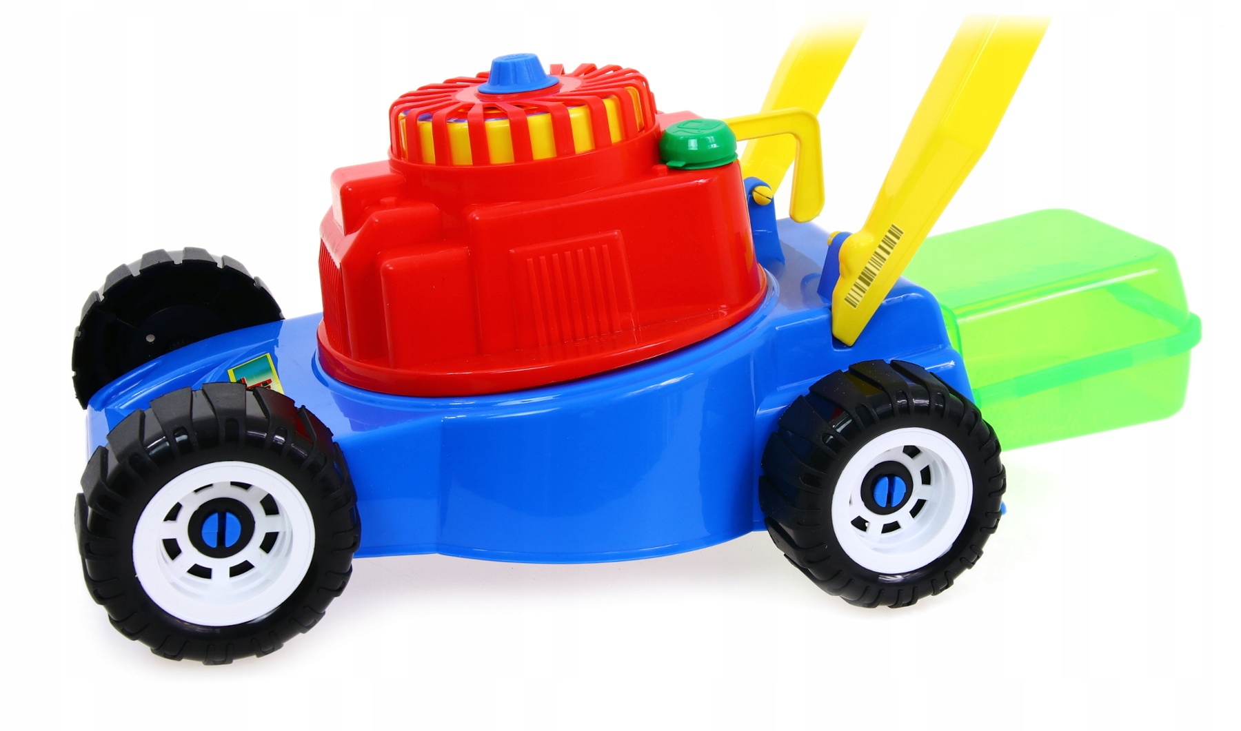 Косарка оснащена кошиком із кульками, які висипаються під час руху, створюючи ефект насипання трави.