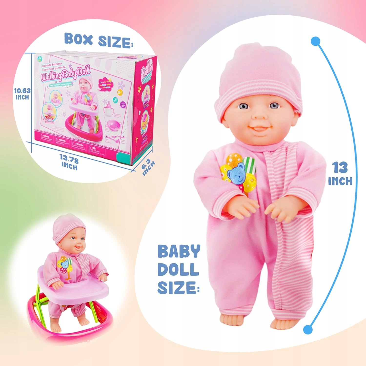 Лялька має чарівне, реалістичне обличчя, а руки та ноги зроблені з безпечного, м'якого вінілу. Рожеві смуги приємні на дотик і легко зняти. Уокер міцний, складний, має м'які подушки та колеса, що дозволяють рух - ідеально підходить для активних розваг.