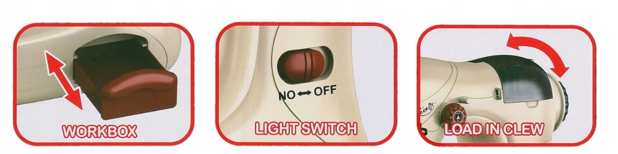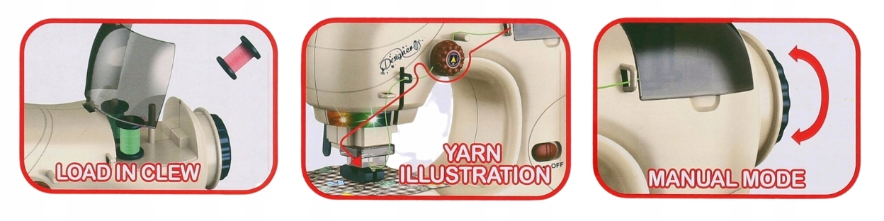 Він активується педаллю або ручною ручкою, має котушки з нитками, ручний режим, вимикач світла та висувний ящик.