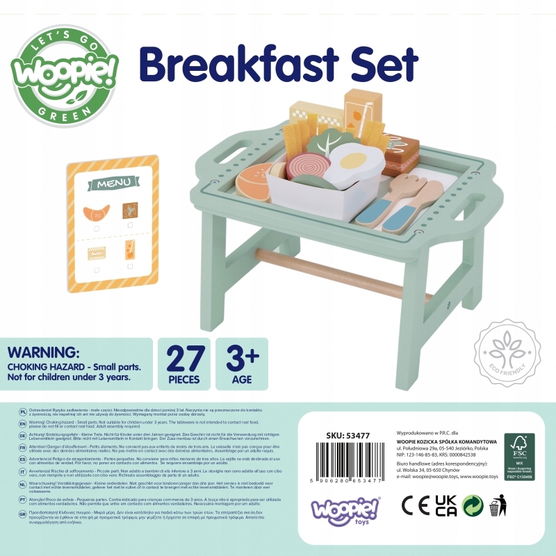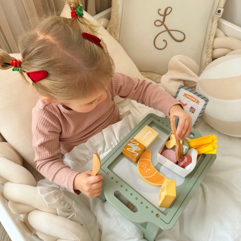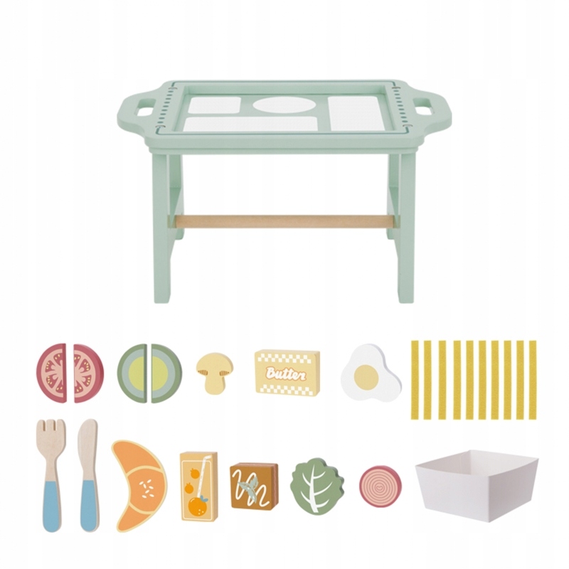 - Набір для сніданку. Смачний початок дня! Звільніть місце на столі для своїх маленьких кухарів і запишіться на унікальну кулінарну пригоду! Наш пастельний набір для сніданку - це хіт, який зробить кожен день смачнішим і щасливішим. Ця іграшка - скарб для маленьких любителів кулінарії. Дозвольте їм весело подавати смачну їжу та відкрийте для себе радість приготування їжі! Чарівний, пастельний посуд і реалістичні дерев'яні аксесуари перетворять кожну страву на маленький витвір мистецтва. Чудовий, стильний набір для дітей від 3 років, який стимулюватиме їх уяву та творчі здібності. У набір входить: - елегантний, пастельний піднос - смачний круасан - смажене яйце - свіжі овочі: помідор, огірок і цибуля - гриб - шматок вершкового масла - лист салату - паста - справжній делікатес! - апельсиновий сік, який додасть вам енергії - солодке шоколадне печиво - виделка і ніж - чудова миска - меню з привабливими варіантами страв Всі елементи виготовлені з натуральної деревини, що забезпечує довговічність, безпеку та екологічність. А 26 частин іграшки забезпечать години чудового задоволення!