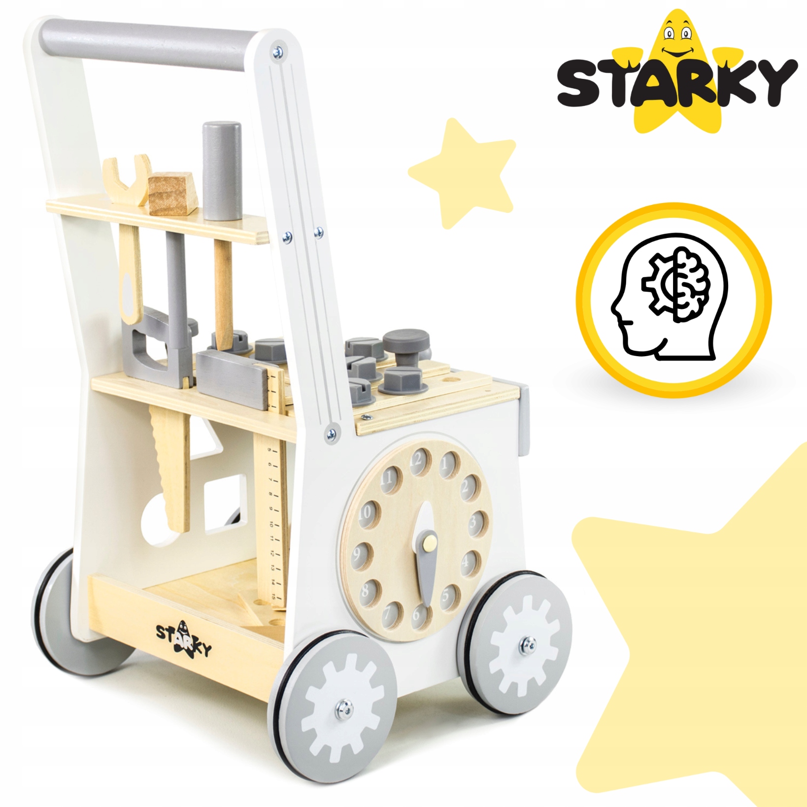☑ Ідеальний вибір для дітей, які роблять свої перші кроки - це дерев’яний ходук - це не лише підтримка під час навчання ходити, але й справжній майданчик в одному. Малюк буде необмежено весело завдяки штовхачам та робочому столу . Набір інструментів розвиває ручну ефективність, координацію рук та допомагає практикувати концентрацію та рухові навички. Годинник з рухомими підказками приверне увагу малюка, а сортувальник для колодки дуже весела у відповідних формах. Надзвичайно стійкий і безпечний - це чудова іграшка, яка буде тягнути дитину довгі години!