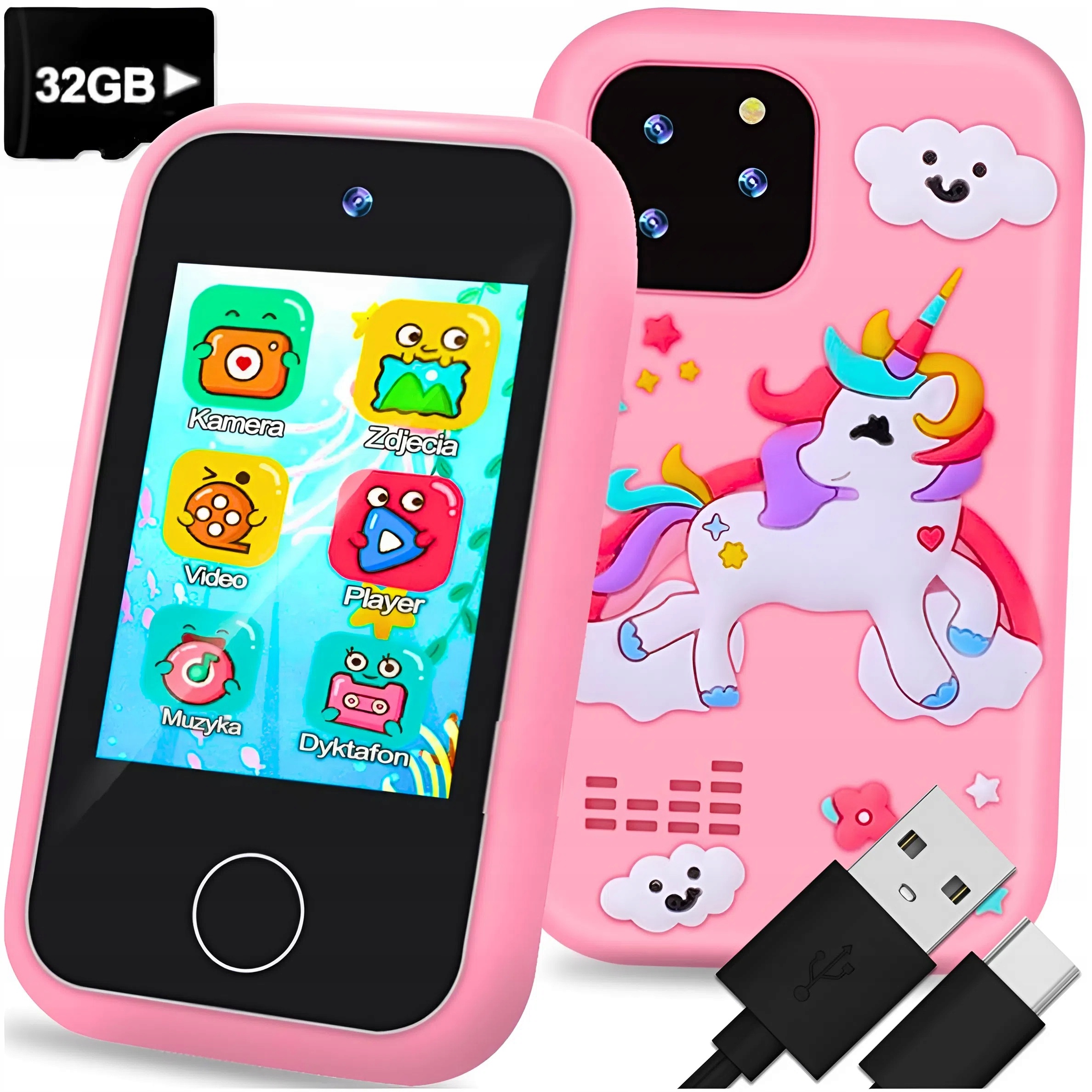 Це один чарівний смартфон для дітей рожевого — ідеальний пристрій для творчого навчання та розваг. У ньому є камера, ігри, музика, малювання, а в комплекті є карта пам'яті на 32 Гб, завдяки якій дитина може зберігати багато фото і відео.