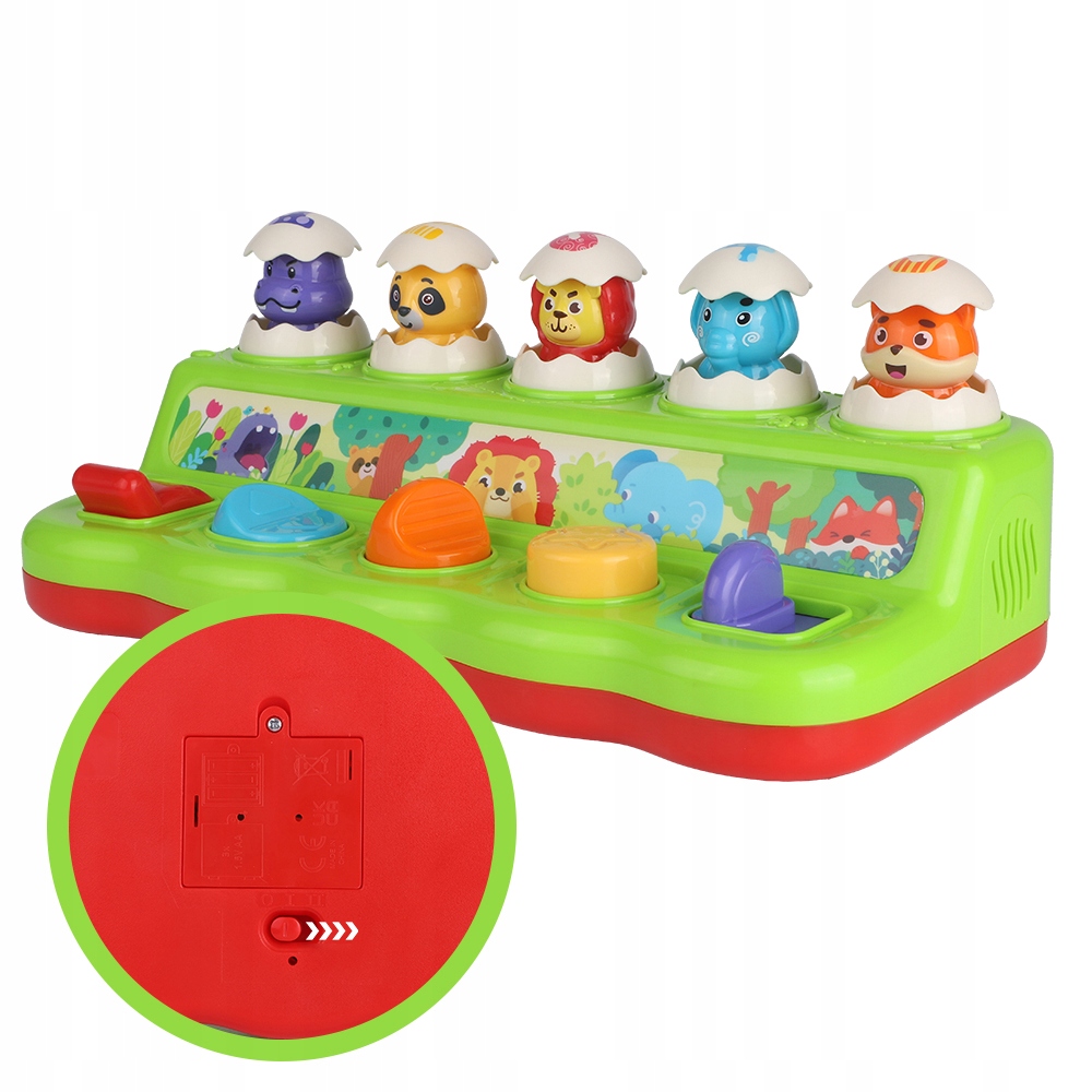 Покращена спливаюча іграшка Інтерактивна спливаюча іграшка включає два різні режими гри. Режим 1: коли ви натискаєте кнопку, з’являються приховані тварини під супровід музики/звуків тварин. Режим 2: слідкуйте за світлом, щоб пересувати кнопки та знаходити прихованих тварин.