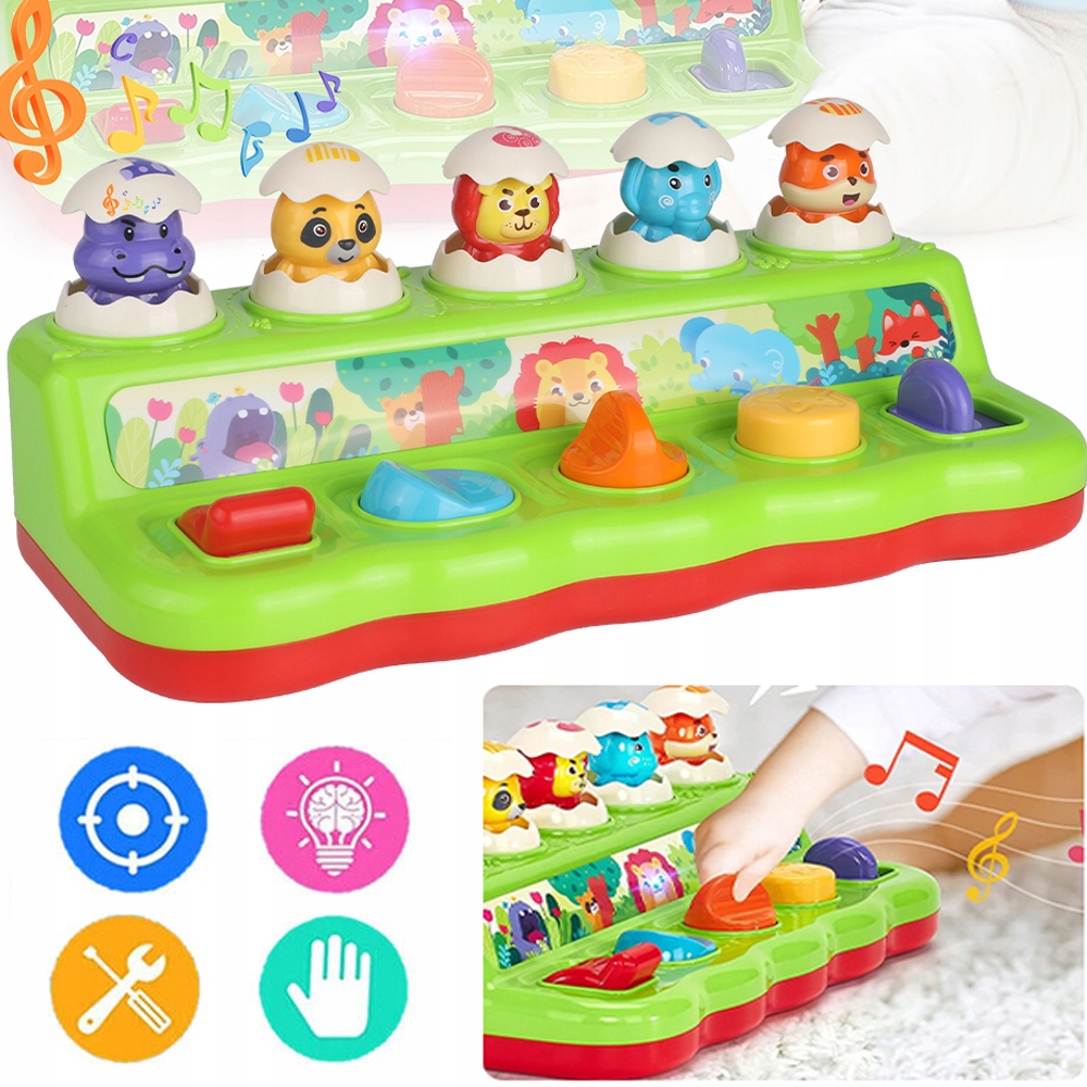 Ідеальна іграшка для малюків із висувним яйцем, яке ідеально підходить для захоплення та погладжування, щоб зміцнити м’язи рук вашої дитини. Коли ви активуєте важіль, перемикач, ручку чи кнопку, тварина вистрибує. Чудово підходить для сенсорного дослідження та раннього розвитку.